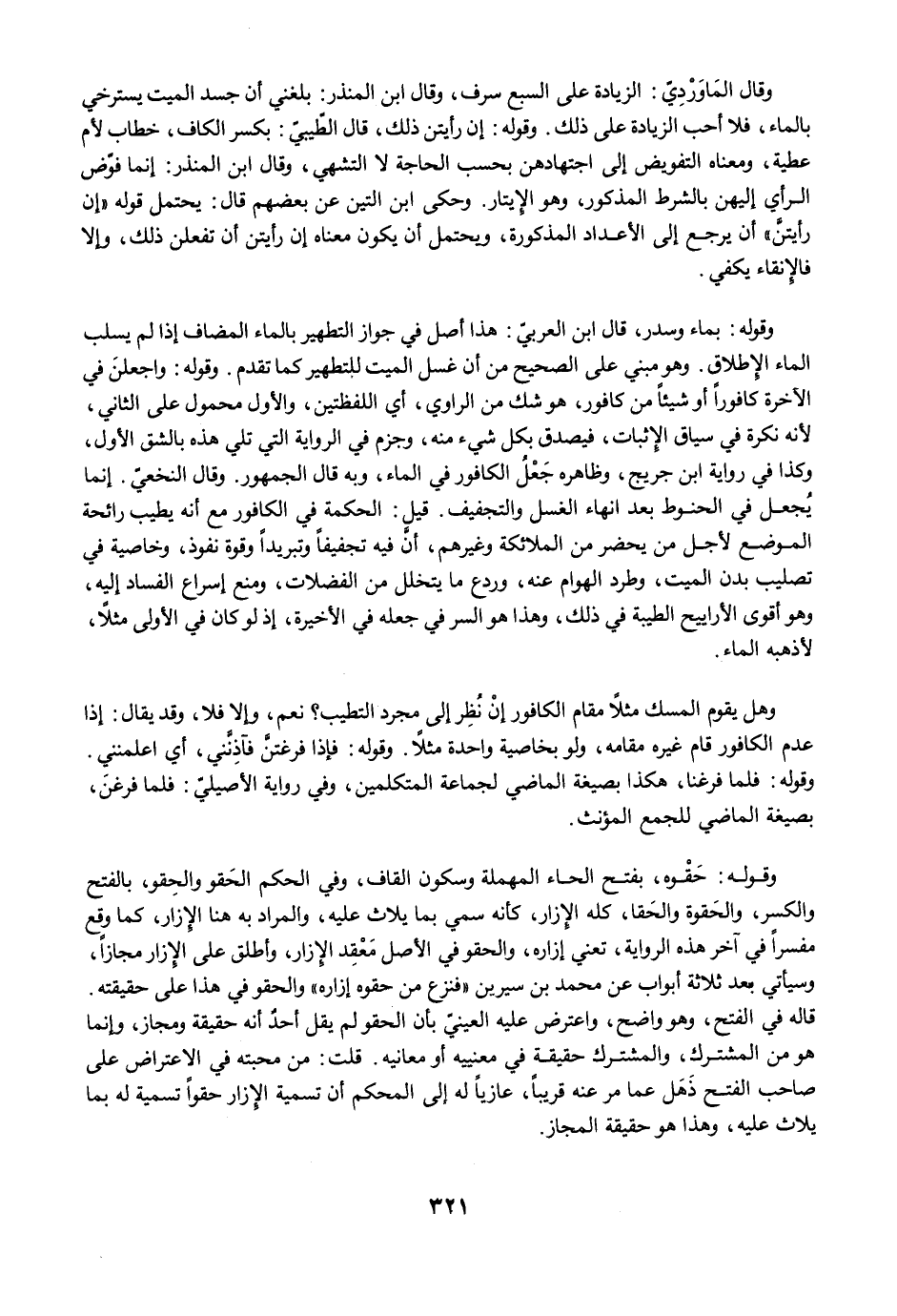وقوله: بماء وسدر، قال ابن العربى: هذا أصل في جواز التطهير بالماء المضاف إذا لم يسلب الماء الإطلاق. وهو مبني على الصحيح من أن غسل الميت للتطهير كما تقدم. وقوله: واجعلنَ في الآخرة كافورًا أو شيئًا من كافور، هو شك من الراوي، أي اللفظتين، والأول محمول على الثاني، لأنه نكرة في سياق الإثبات، فيصدق بكل شيء منه، وجزم في الرواية التي تلي هذه بالشق الأول، وكذا في رواية ابن جريج، وظاهره جَعْلُ الكافور في الماء، وبه قال الجمهور. وقال النخعيّ. إنما يُجعل في الحنوط بعد انهاء الغسل والتجفيف. قيل: الحكمة في الكافور مع أنه يطيب رائحة الموضع لأجل من يحضر من الملائكة وغيرهم، أنَّ فيه تجفيفًا وتبريدًا وقوة نفوذ، وخاصية في تصليب بدن الميت، وطرد الهوام عنه، وردع ما يتخلل من الفضلات، ومنع إسراع الفساد إليه، وهو أقوى الأراييح الطيبة في ذلك، وهذا هو السر في جعله في الأخيرة، إذ لو كان في الأولى مثلًا، لأذهبه الماء.