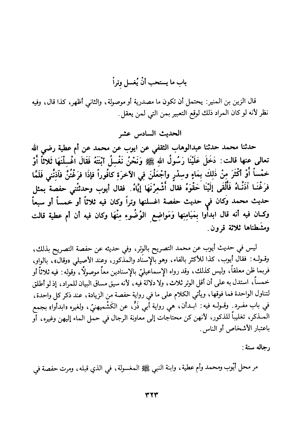 ليس في حديث أيوب عن محمد التصريح بالوتر، وفي حديثه عن حفصة التصريح بذلك، وقوله: فقال أيوب، كذا للأكثر بالفاء، وهو بالإِسناد والمذكور، وعند الأصيلي "وقال"، بالواو، فربما ظن معلقًا، وليس كذلك، وقد رواه الإِسماعيليّ بالإِسنادين معًا موصولًا، وقوله: فيه ثلاثًا أو خمسًا، استدل به على أن أقل الوتر ثلاث، ولا دلالة فيه، لأنه سيق مساق البيان للمراد، إذ لو أطلق لتناول الواحدة فما فوقها، ويأتي الكلام على ما في رواية حفصة من الزيادة، عند ذكر كل واحدة، في باب مفرد. وقوله فيه: ابدأن، هي رواية أبي ذَرٍّ، عن الكَشْميهنيّ، ولغيره "ابدأوا" بجمع المذكر، تغليبًا للذكور، لأنهن كن محتاجات إلى معاونة الرجال في حمل الماء إليهن وغيره، أو باعتبار الأشخاص أو الناس.