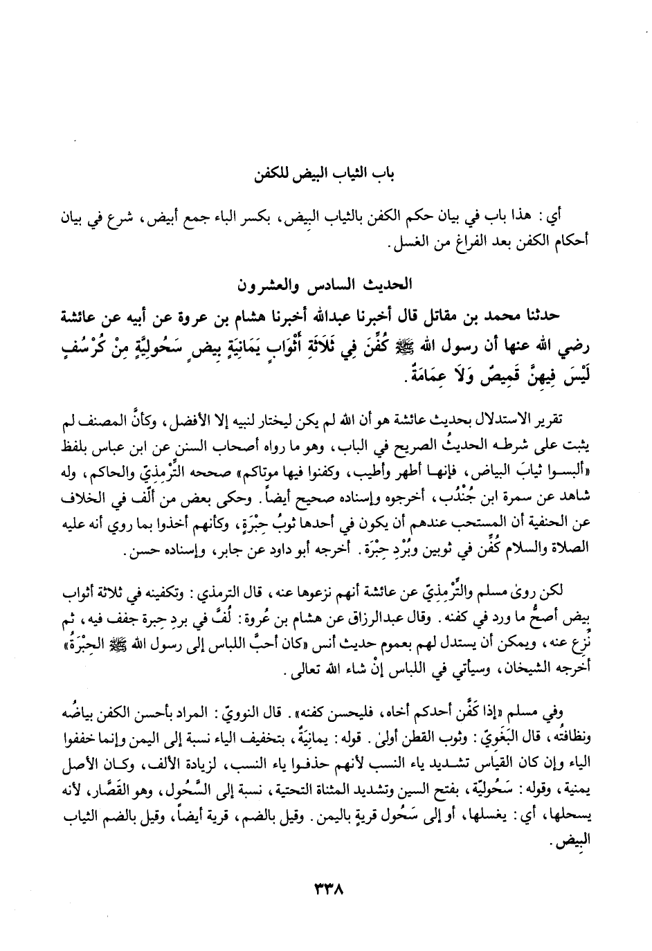 لكن روى مسلم والتِّرْمِذِيّ عن عائشة أنهم نزعوها عنه، قال الترمذي: وتكفينه في ثلاثة أثواب بيض أصحُّ ما ورد في كفنه. وقال عبد الرزاق عن هشام بن عُروة: لُفَّ في بردِ حِبرة جفف فيه، ثم نُزع عنه، ويمكن أن يستدل لهم بعموم حديث أنس "كان أحبَّ اللباس إلى رسول الله -صلى الله عليه وسلم- الحِبْرَةُ" أخرجه الشيخان، وسيأتي في اللباس إنْ شاء الله تعالى.