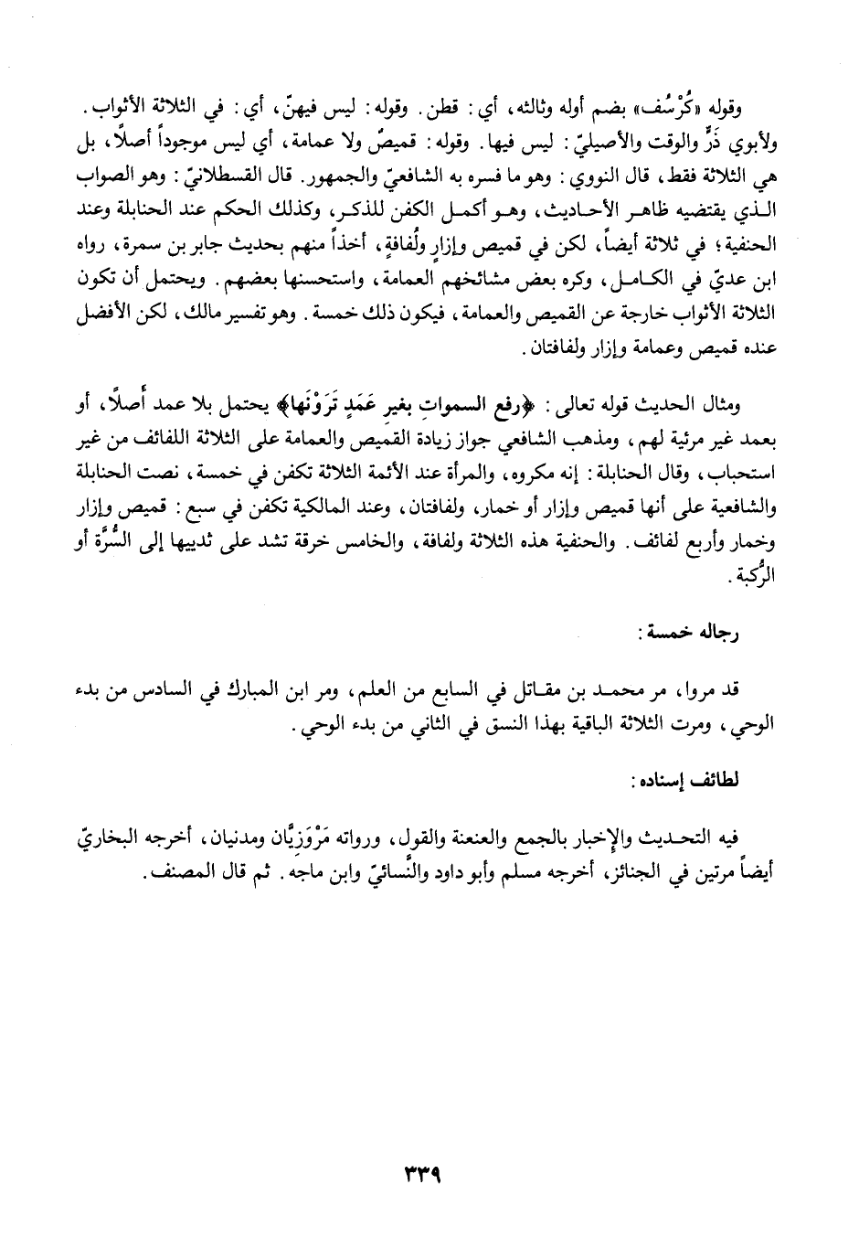 وقوله "كُرْسُف" بضم أوله وثالثه، أي: قطن. وقوله: ليس فيهنّ، أي: في الثلاثة الأثواب. ولأبوي ذَرٍّ والوقت والأصيليّ: ليس فيها. وقوله: قميصٌ ولا عمامة، أي ليس موجودًا أصلًا، بل هي الثلاثة فقط، قال النووي: وهو ما فسره به الشافعيّ والجمهور. قال القسطلانيّ: وهو الصواب الذي يقتضيه ظاهر الأحاديث، وهو أكمل الكفن للذكر، وكذلك الحكم عند الحنابلة وعند الحنفية؛ في ثلاثة أيضًا، لكن في قميص وإزارٍ ولُفافةٍ، أخذًا منهم بحديث جابر بن سمرة، رواه ابن عديّ في الكامل، وكره بعض مشائخهم العمامة، واستحسنها بعضهم. ويحتمل أن تكون الثلاثة الأثواب خارجة عن القميص والعمامة، فيكون ذلك خمسة. وهو تفسير مالك، لكن الأفضل عنده قميص وعمامة وإزار ولفافتان.