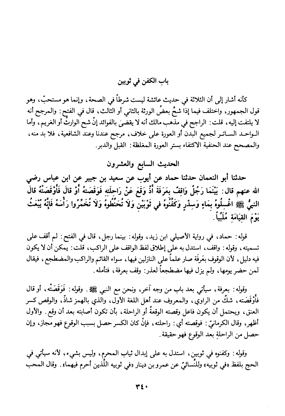 حَدَّثَنَا أَبُو النُّعْمَانِ حَدَّثَنَا حَمَّادُ عَنْ أَيُّوبَ عَنْ سَعِيدِ بْنِ جُبَيْرٍ عَنِ ابْنِ عَبَّاسٍ رضي الله عنهم قَالَ: بَيْنَمَا رَجُلٌ وَاقِفٌ بِعَرَفَةَ إِذْ وَقَعَ عَنْ رَاحِلَتِهِ فَوَقَصَتْهُ أَوْ قَالَ فَأَوْقَصَتْهُ قَالَ النَّبِيُّ -صلى الله عليه وسلم- اغْسِلُوهُ بِمَاءٍ وَسِدْرٍ، وَكَفِّنُوهُ فِي ثَوْبَيْنِ، وَلاَ تُحَنِّطُوهُ وَلاَ تُخَمِّرُوا رَأْسَهُ، فَإِنَّهُ يُبْعَثُ يَوْمَ الْقِيَامَةِ مُلَبِّيًا.