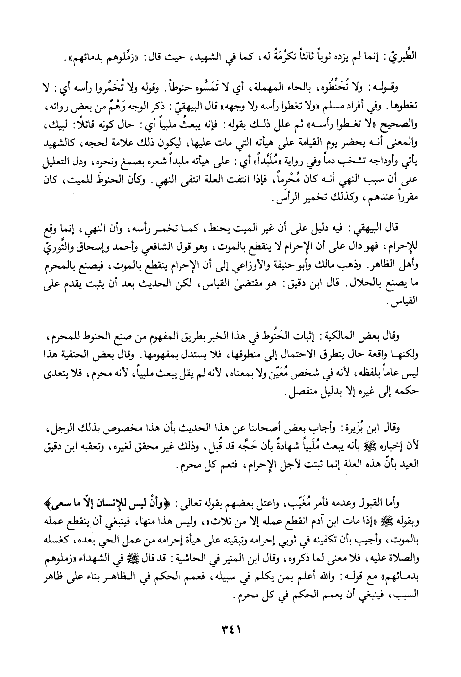 وقوله: ولا تُحَنِّطُوه، بالحاء المهملة، أي لا تَمَسُّوه حنوطًا. وقوله ولا تُخَمِّروا رأسه أي: لا تغطوها. وفي أفراد مسلم "ولا تغطوا رأسه ولا وجهه" قال البيهقيّ: ذكر الوجه وَهْمٌ من بعض رواته، والصحيح "لا تغطوا رأسه" ثم علل ذلك بقوله: فإنه يبعثُ ملبيًا أي: حال كونه قائلًا: لبيك، والمعنى أنه يحضر يوم القيامة على هيأته التي مات عليها, ليكون ذلك علامة لحجه، كالشهيد يأتي وأوداجه تشخب دمًا وفي رواية "مُلَبَّدًا" أي: على هيأته ملبدًا شعره بصمغ ونحوه، ودل التعليل على أن سبب النهي أنه كان مُحْرِمًا، فإذا انتفت العلة انتفى النهي. وكان الحنوطَ للميت، كان مقررًا عندهم، وكذلك تخمير الرأس.