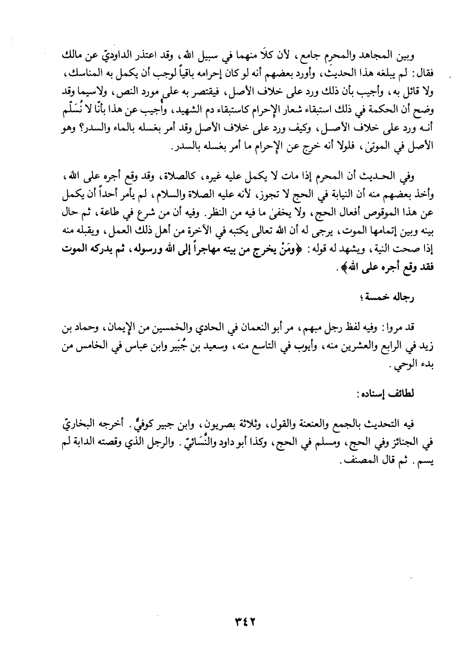 وبين المجاهد والمحرِم جامع, لأن كلا منهما في سبيل الله، وقد اعتذر الداوديّ عن مالك فقال: لم يبلغه هذا الحديث، وأورد بعضهم أنه لو كان إحرامه باقيًا لوجب أن يكمل به المناسك، ولا قائل به، وأجيب بأن ذلك ورد على خلاف الأصل، فيقتصر به على مورد النص، ولاسيما وقد وضح أن الحكمة في ذلك استبقاء شعار الإِحرام كاستبقاء دم الشهيد، وأُجيب عن هذا بأنّا لا نُسَلّم أنه ورد على خلاف الأصل، وكيف ورد على خلاف الأصل وقد أمر بغسله بالماء والسدر؟ وهو الأصل في الموتى، فلولا أنه خرج عن الإِحرام ما أمر بغسله بالسدر.