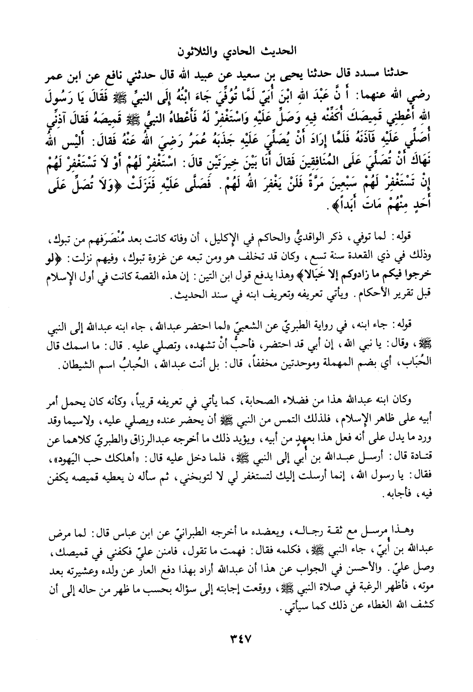 حَدَّثَنَا مُسَدَّدٌ قَالَ حَدَّثَنَا يَحْيَى بْنُ سَعِيدٍ عَنْ عُبَيْدِ اللَّهِ قَالَ حَدَّثَنِي نَافِعٌ عَنِ ابْنِ عُمَرَ رضي الله عنهما: أَنَّ عَبْدَ اللَّهِ بْنَ أُبَيٍّ لَمَّا تُوُفِّيَ جَاءَ ابْنُهُ إِلَى النَّبِيِّ -صلى الله عليه وسلم- فَقَالَ يَا رَسُولَ اللَّهِ أَعْطِنِى قَمِيصَكَ أُكَفِّنْهُ فِيهِ، وَصَلِّ عَلَيْهِ وَاسْتَغْفِرْ لَهُ، فَأَعْطَاهُ النَّبِيُّ -صلى الله عليه وسلم- قَمِيصَهُ فَقَالَ آذِنِّي أُصَلِّي عَلَيْهِ. فَآذَنَهُ، فَلَمَّا أَرَادَ أَنْ يُصَلِّيَ عَلَيْهِ جَذَبَهُ عُمَرُ رضي الله عنه فَقَالَ: أَلَيْسَ اللَّهُ نَهَاكَ أَنْ تُصَلِّيَ عَلَى الْمُنَافِقِينَ فَقَالَ أَنَا بَيْنَ خِيرَتَيْنِ قَالَ: {اسْتَغْفِرْ لَهُمْ أَوْ لَا تَسْتَغْفِرْ لَهُمْ إِنْ تَسْتَغْفِرْ لَهُمْ سَبْعِينَ مَرَّةً فَلَنْ يَغْفِرَ اللَّهُ لَهُمْ}. فَصَلَّى عَلَيْهِ فَنَزَلَتْ {وَلَا تُصَلِّ عَلَى أَحَدٍ مِنْهُمْ مَاتَ أَبَدًا}.