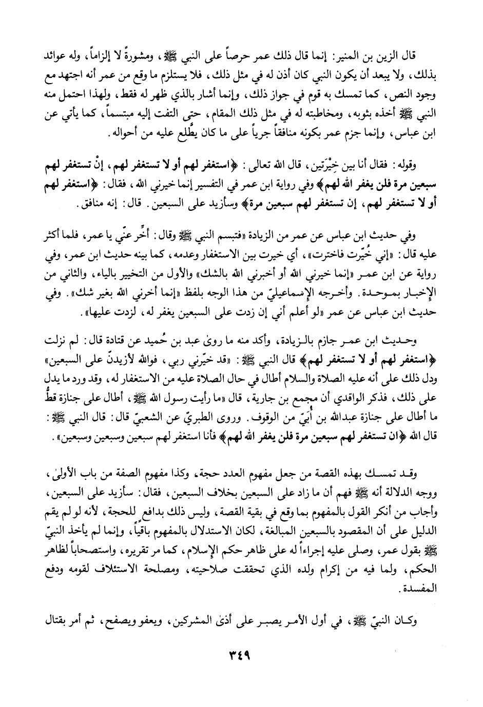 وحديث ابن عمر جازم بالزيادة، وأكد منه ما روى عبد بن حُميد عن قتادة قال: لم نزلت {اسْتَغْفِرْ لَهُمْ أَوْ لَا تَسْتَغْفِرْ لَهُمْ} قال النبي -صلى الله عليه وسلم-: "قد خيّرني ربي، فوالله لأزيدنّ على السبعين" ودل ذلك على أنه عليه الصلاة والسلام أطال في حال الصلاة عليه من الاستغفار له، وقد ورد ما يدل على ذلك، فذكر الواقدي أن مجمع بن جارية، قال "ما رأيت رسول الله -صلى الله عليه وسلم-، أطال على جنازة قطُّ ما أطال على جنازة عبد الله بن أُبَيّ من الوقوف. وروى الطبريّ عن الشعبيّ قال: قال النبي -صلى الله عليه وسلم-: قال الله {إِنْ تَسْتَغْفِرْ لَهُمْ سَبْعِينَ مَرَّةً فَلَنْ يَغْفِرَ اللَّهُ لَهُمْ} فأنا استغفر لهم سبعين وسبعين وسبعين".