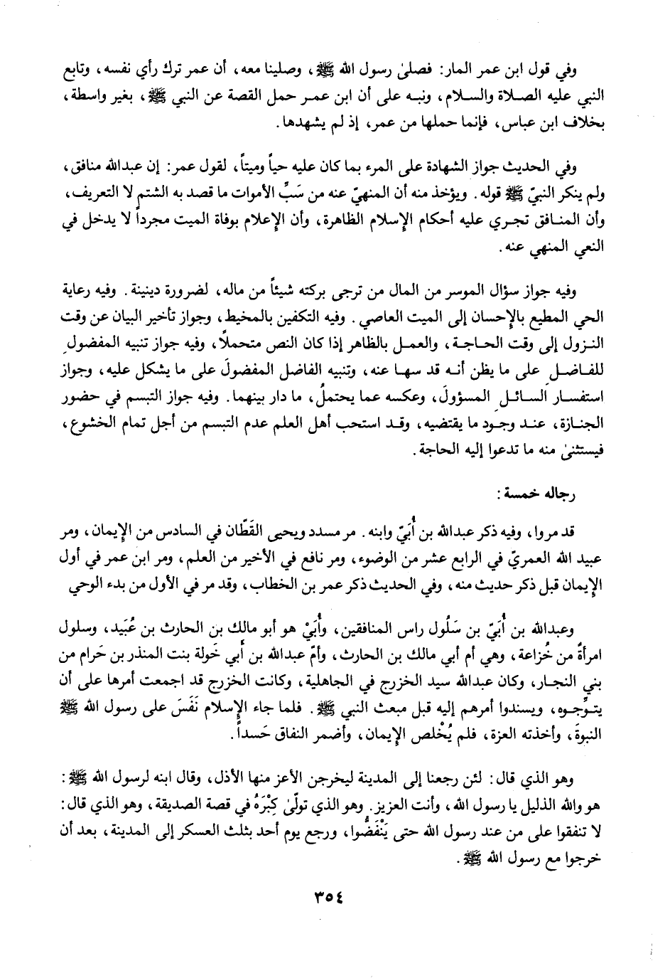 وفي الحديث جواز الشهادة على المرء بما كان عليه حيًا وميتًا، لقول عمر: إن عبد الله منافق، ولم ينكر النبيّ -صلى الله عليه وسلم- قوله. ويؤخذ منه أن المنهيّ عنه من سَبِّ الأموات ما قصد به الشتم لا التعريف، وأن المنافق تجري عليه أحكام الإِسلام الظاهرة، وأن الإعلام بوفاة الميت مجردًا لا يدخل في النعي المنهي عنه.