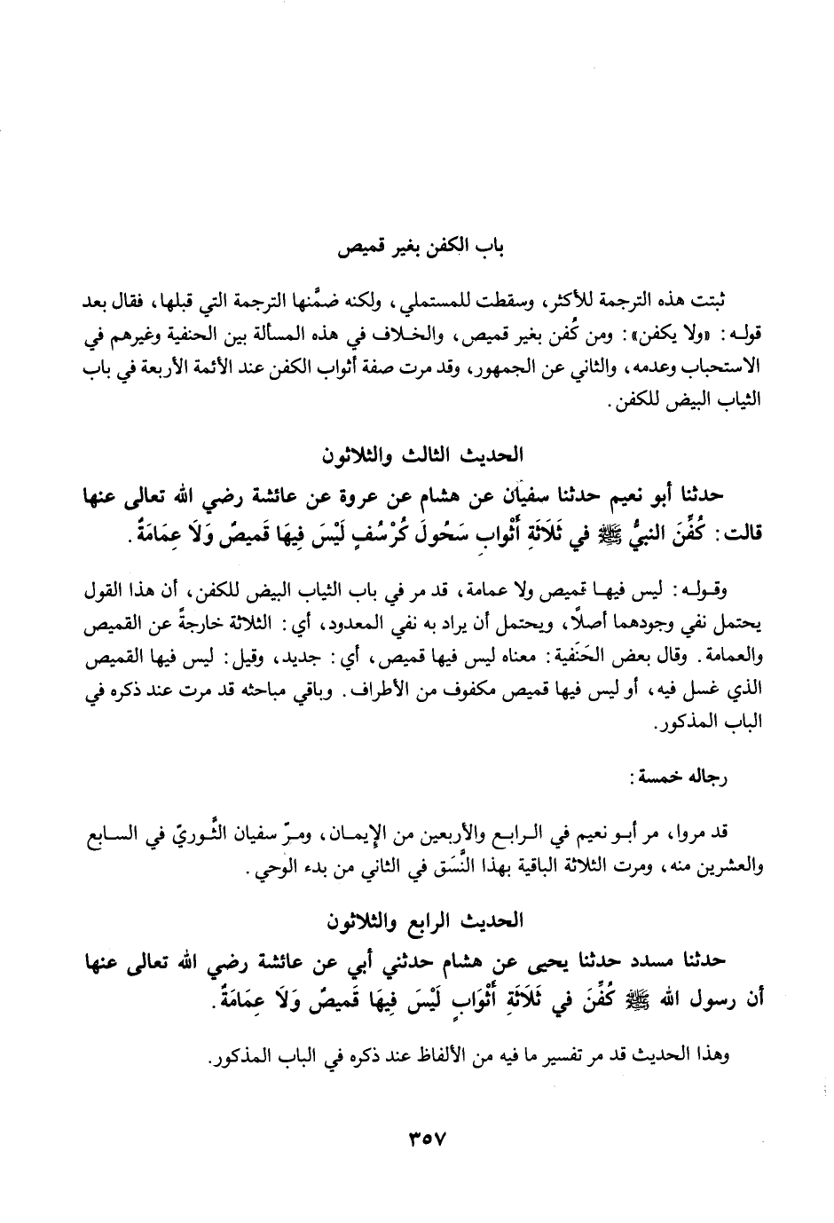 حَدَّثَنَا أَبُو نُعَيْمٍ حَدَّثَنَا سُفْيَانُ عَنْ هِشَامٍ عَنْ عُرْوَةَ عَنْ عَائِشَةَ رضي الله عنها قَالَتْ: كُفِّنَ النَّبِيُّ -صلى الله عليه وسلم- فِي ثَلاَثَةِ أَثْوَابِ سَحُولَ كُرْسُفٍ، لَيْسَ فِيهَا قَمِيصٌ وَلاَ عِمَامَةٌ.
