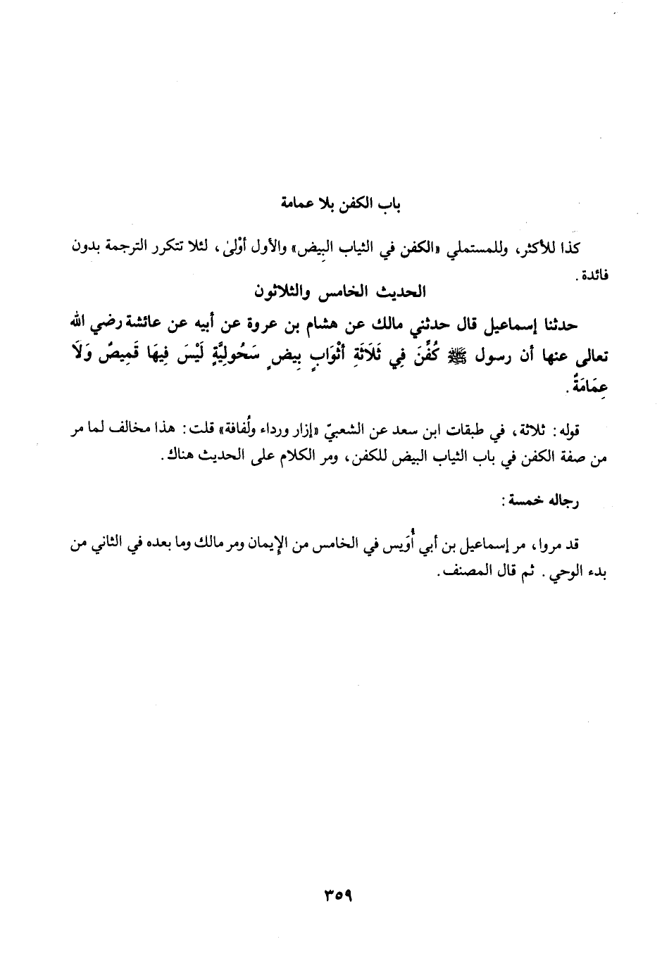 حَدَّثَنَا إِسْمَاعِيلُ قَالَ حَدَّثَنِي مَالِكٌ عَنْ هِشَامِ بْنِ عُرْوَةَ عَنْ أَبِيهِ عَنْ عَائِشَةَ رضي الله عنها أَنَّ رَسُولَ اللَّهِ -صلى الله عليه وسلم- كُفِّنَ فِي ثَلاَثَةِ أَثْوَابٍ بِيضٍ سَحُولِيَّةٍ، لَيْسَ فِيهَا قَمِيصٌ وَلاَ عِمَامَةٌ.