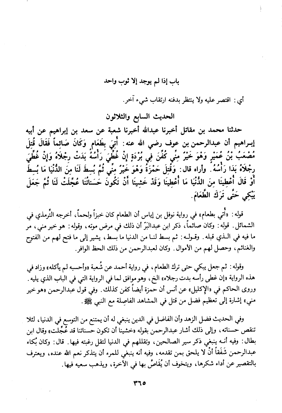 حَدَّثَنَا مُحَمَّدُ بْنُ مُقَاتِلٍ أَخْبَرَنَا عَبْدُ اللَّهِ أَخْبَرَنَا شُعْبَةُ عَنْ سَعْدِ بْنِ إِبْرَاهِيمَ عَنْ أَبِيهِ إِبْرَاهِيمَ أَنَّ عَبْدَ الرَّحْمَنِ بْنَ عَوْفٍ رضي الله عنه: أُتِيَ بِطَعَامٍ وَكَانَ صَائِمًا فَقَالَ قُتِلَ مُصْعَبُ بْنُ عُمَيْرٍ وَهُوَ خَيْرٌ مِنِّي، كُفِّنَ فِي بُرْدَةٍ، إِنْ غُطِّيَ رَأْسُهُ بَدَتْ رِجْلاَهُ، وَإِنْ غُطِّيَ رِجْلاَهُ بَدَا رَأْسُهُ وَأُرَاهُ قَالَ: وَقُتِلَ حَمْزَةُ وَهُوَ خَيْرٌ مِنِّي، ثُمَّ بُسِطَ لَنَا مِنَ الدُّنْيَا مَا بُسِطَ أَوْ قَالَ أُعْطِينَا مِنَ الدُّنْيَا مَا أُعْطِينَا وَقَدْ خَشِينَا أَنْ تَكُونَ حَسَنَاتُنَا عُجِّلَتْ لَنَا، ثُمَّ جَعَلَ يَبْكِي حَتَّى تَرَكَ الطَّعَامَ.