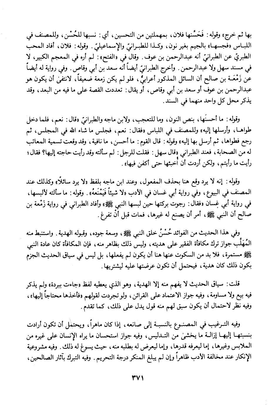 وفيه الترغيب في المصنوع بالنسبة إلى صانعه، إذا كان ماهرًا، ويحتمل أن تكون أرادت بنسبتها إليها إزالة ما يخشى من التدليس، وفيه جواز استحسان ما يراه الإِنسان على غيره من الملابس وغيرها، إما ليعرفه قدرها، وإما ليعرض له بطلبه منه، حيث يسوغ له ذلك. وفيه مشروعية الإِنكار عند مخالفة الأدب ظاهرًا وإن لم يبلغ المنكر درجة التحريم. وفيه التبرك بآثار الصالحين،