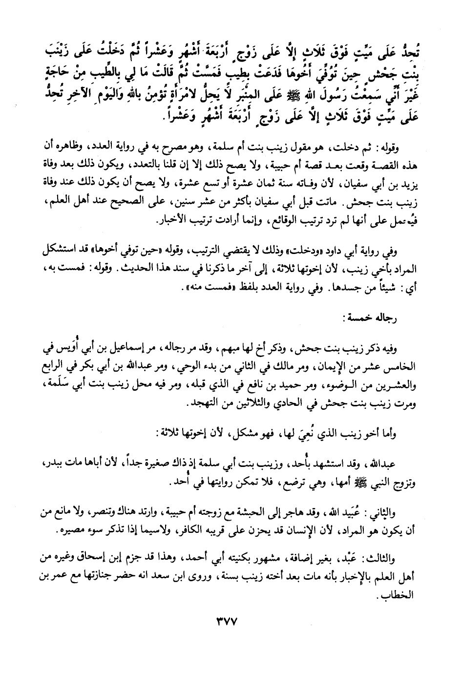 تُحِدُّ عَلَى مَيِّتٍ فَوْقَ ثَلاَثٍ، إِلاَّ عَلَى زَوْجٍ أَرْبَعَةَ أَشْهُرٍ وَعَشْرًا. ثُمَّ دَخَلْتُ عَلَى زَيْنَبَ بِنْتِ جَحْشٍ حِينَ تُوُفِّيَ أَخُوهَا، فَدَعَتْ بِطِيبٍ فَمَسَّتْ ثُمَّ قَالَتْ مَا لِي بِالطِّيبِ مِنْ حَاجَةٍ، غَيْرَ أَنِّي سَمِعْتُ رَسُولَ اللَّهِ -صلى الله عليه وسلم- عَلَى الْمِنْبَرِ يَقُولُ لاَ يَحِلُّ لاِمْرَأَةٍ تُؤْمِنُ بِاللَّهِ وَالْيَوْمِ الآخِرِ تُحِدُّ عَلَى مَيِّتٍ فَوْقَ ثَلاَثٍ، إِلاَّ عَلَى زَوْجٍ أَرْبَعَةَ أَشْهُرٍ وَعَشْرًا.