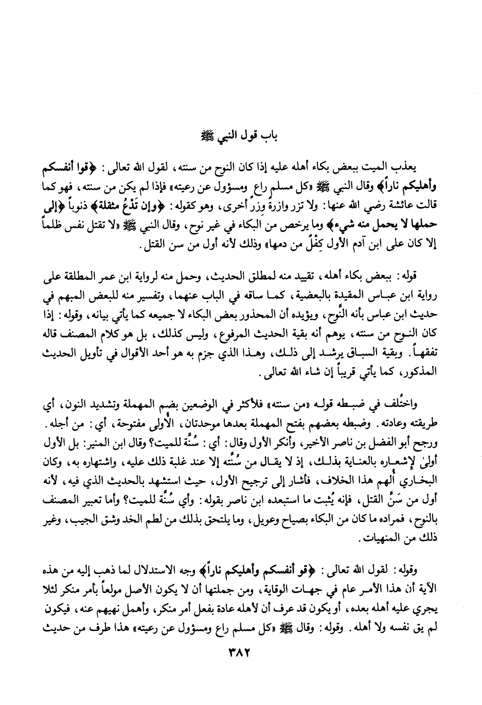 واختُلف في ضبطه قوله "من سنته" فلأكثر في الوضعين بضم المهملة وتشديد النون، أي طريقته وعادته. وضبطه بعضهم بفتح المهملة بعدها موحدتان، الأُولى مفتوحة، أي: من أجله. ورجح أبو الفضل بن ناصر الأخير، وأنكر الأول وقال: أي: سُنَّة للميت؟ وقال ابن المنير: بل الأول أولى لإشعاره بالعناية بذلك، إذ لا يقال من سُنَّته إلا عند غلبة ذلك عليه، واشتهاره به، وكان البخاري أُلهم هذا الخلاف، فأشار إلى ترجيح الأول، حيث استشهد بالحديث الذي فيه, لأنه أول من سَنَّ القتل، فإنه يُثبت ما استبعده ابن ناصر بقوله: وأي سُنَّة للميت؟ وأما تعبير المصنف بالنوح، فمراده ما كان من البكاء بصياح وعويل، وما يلتحق بذلك من لطم الخد وشق الجيب، وغير ذلك من المنهيات.
