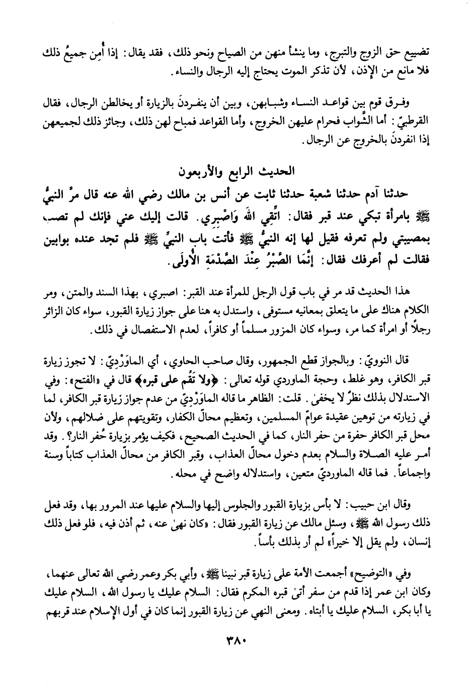 وقال ابن حبيب: لا بأس بزيارة القبور والجلوس إليها والسلام عليها عند المرور بها، وقد فعل ذلك رسول الله -صلى الله عليه وسلم-، وسئل مالك عن زيارة القبور فقال: "كان نهى عنه، ثم أذن فيه، فلو فعل ذلك إنسان، ولم يقل إلا خيرًا" لم أر بذلك بأسًا.