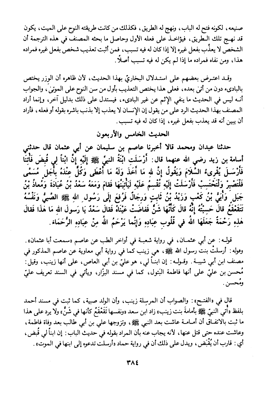 قال في "الفتح": والصواب أن المرسِلة زينب، وأن الولد صبية، كما ثبت في مسند أحمد بلفظ "أُتي النبيّ -صلى الله عليه وسلم- بأمامةَ بنت زينب" زاد ابن سعد "ونفسها تَقَعْقَعُ كأنها في شَنٍّ" ولا يرد على هذا ما ثبت بالاتفاق أن أمامة عاشت بعد النبي -صلى الله عليه وسلم-، وتزوجها علي بن أبي طالب بعد وفاة فاطمة، وعاشت عنده حتى قتل عنها, لأنه يجاب عنه بأن المراد بقوله في حديث الباب: إن ابنًا لي قُبض، أي: قارب أن يُقْبَض، ويدل على ذلك أن في رواية حماد "أرسلت تدعوه إلى ابنها في الموت".