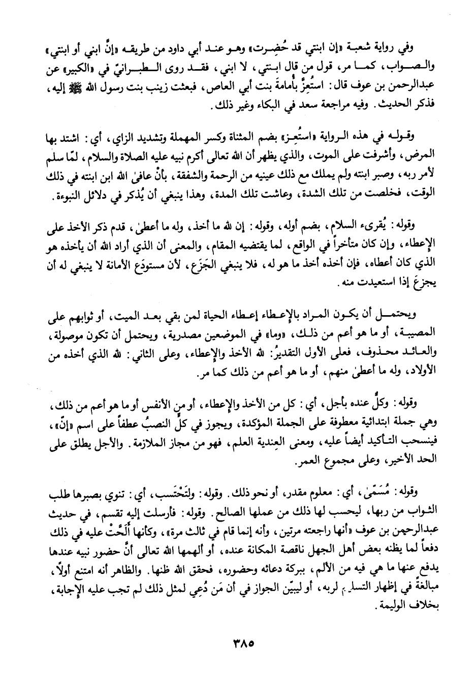 وقوله: مُسَمّى، أي: معلوم مقدر، أو نحو ذلك. وقوله: ولتَحْتَسب، أي: تنوي بصبرها طلب الثواب من ربها, ليحسب لها ذلك من عملها الصالح. وقوله: فأرسلت إليه تقسم، في حديث عبد الرحمن بن عوف "أنها راجعته مرتين، وأنه إنما قام في ثالث مرة"، وكأنها أَلَحَّتْ عليه في ذلك دفعًا لما يظنه بعض أهل الجهل ناقصة المكانة عنده، أو ألهمها الله تعالى أنَّ حضور نبيه عندها يدفع عنها ما هي فيه من الألم، ببركة دعائه وحضوره، فحقق الله ظنها. والظاهر أنه امتنع أولًا، مبالغةً في إظهار التسليم لربه، أو ليبيّن الجواز في أن مَن دُعِي لمثل ذلك لم تجب عليه الإِجابة، بخلاف الوليمة.