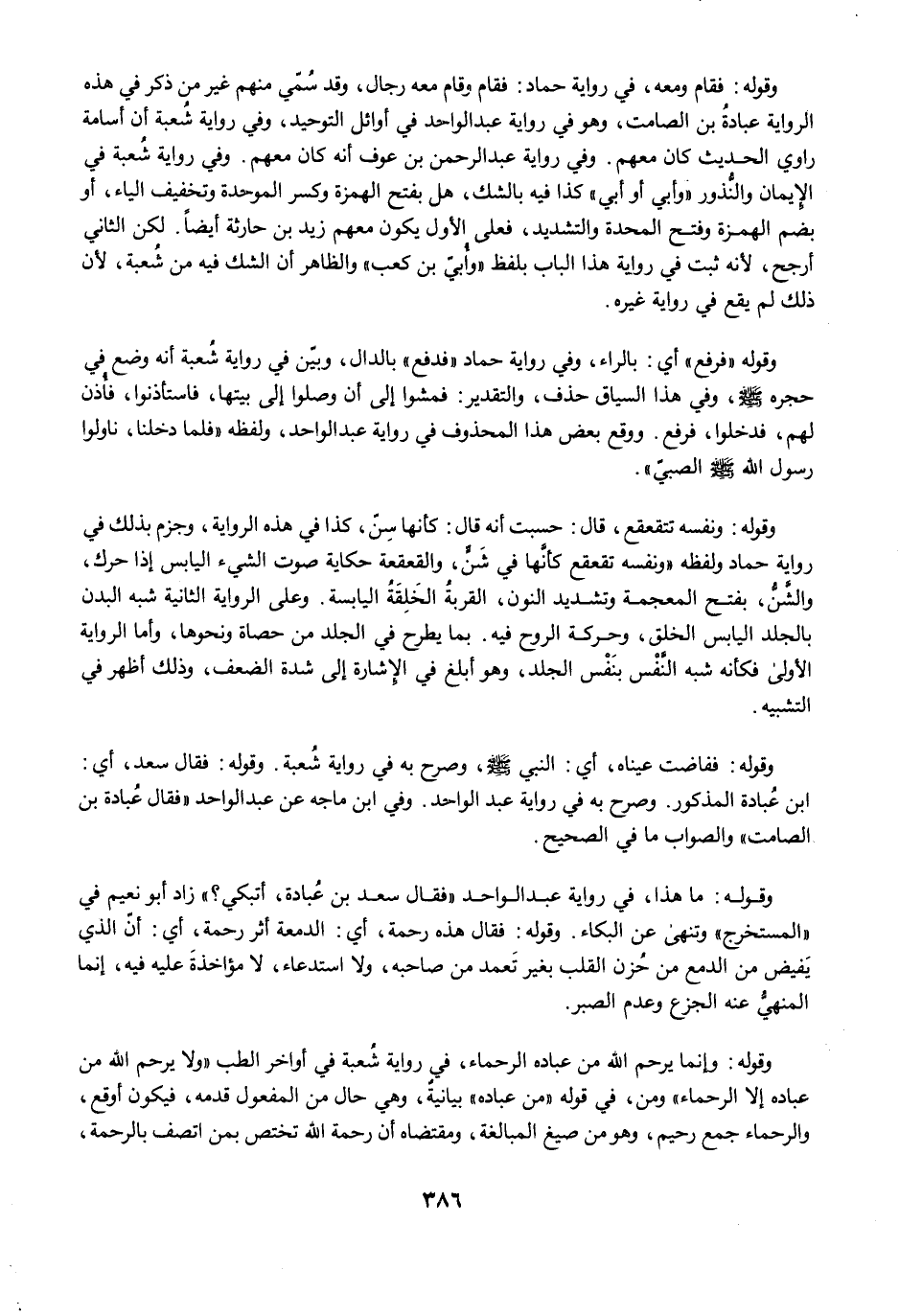 وقوله: فقام ومعه، في رواية حماد: فقام وقام معه رجال، وقد سُمّي منهم غير من ذكر في هذه الرواية عبادةُ بن الصامت، وهو في رواية عبد الواحد في أوائل التوحيد، وفي رواية شُعبة أن أسامة راوي الحديث كان معهم. وفي رواية عبد الرحمن بن عوف أنه كان معهم. وفي رواية شُعبة في الإِيمان والنُّذور "وأبي أو أبي" كذا فيه بالشك، هل بفتح الهمزة وكسر الموحدة وتخفيف الياء، أو بضم الهمزة وفتح الموحدة والتشديد، فعلى الأول يكون معهم زيد بن حارثة أيضًا. لكن الثاني أرجح, لأنه ثبت في رواية هذا الباب بلفظ "وأُبيّ بن كعب" والظاهر أن الشك فيه من شُعبة, لأن ذلك لم يقع في رواية غيره.