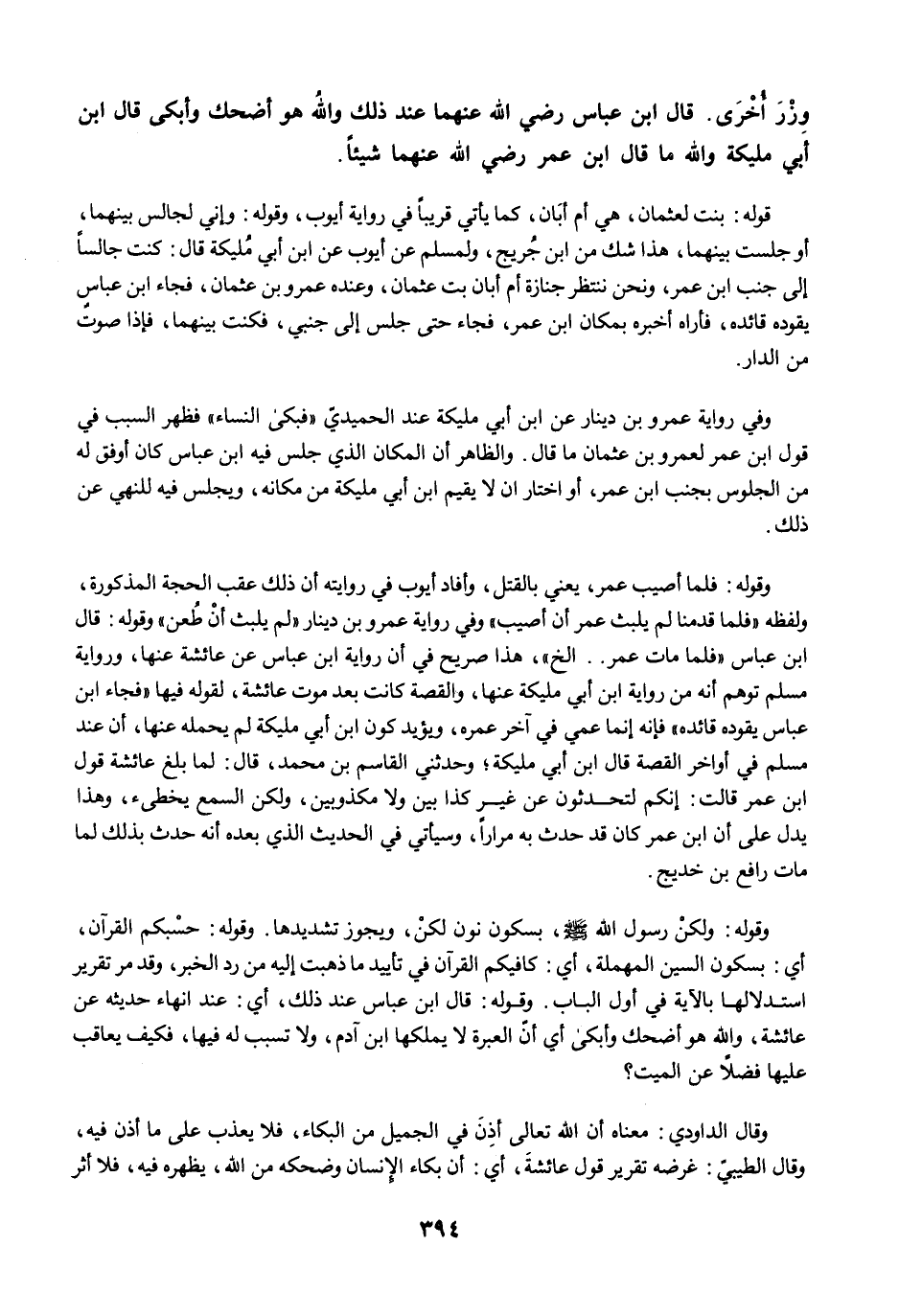 وقوله: فلما أصيب عمر، يعني بالقتل، وأفاد أيوب في روايته أن ذلك عقب الحجة المذكورة، ولفظه "فلما قدمنا لم يلبث عمر أن أصيب" وفي رواية عمرو بن دينار "لم يلبث أنْ طُعن" وقوله: قال ابن عباس "فلما مات عمر .. الخ"، هذا صريح في أن رواية ابن عباس عن عائشة عنها، ورواية مسلم توهم أنه من رواية ابن أبي مليكة عنها، والقصة كانت بعد موت عائشة، لقوله فيها "فجاء ابن عباس يقوده قائده" فإنه إنما عمي في آخر عمره، ويؤيد كون ابن أبي مليكة لم يحمله عنها، أن عند مسلم في أواخر القصة قال ابن أبي مليكة؛ وحدثني القاسم بن محمد، قال: لما بلغ عائشة قول ابن عمر قالت: إنكم لتحدثون عن غير كذا بين ولا مكذوبين، ولكن السمع يخطىء، وهذا يدل على أن ابن عمر كان قد حدث به مرارًا، وسيأتي في الحديث الذي بعده أنه حدث بذلك لما مات رافع بن خديج.