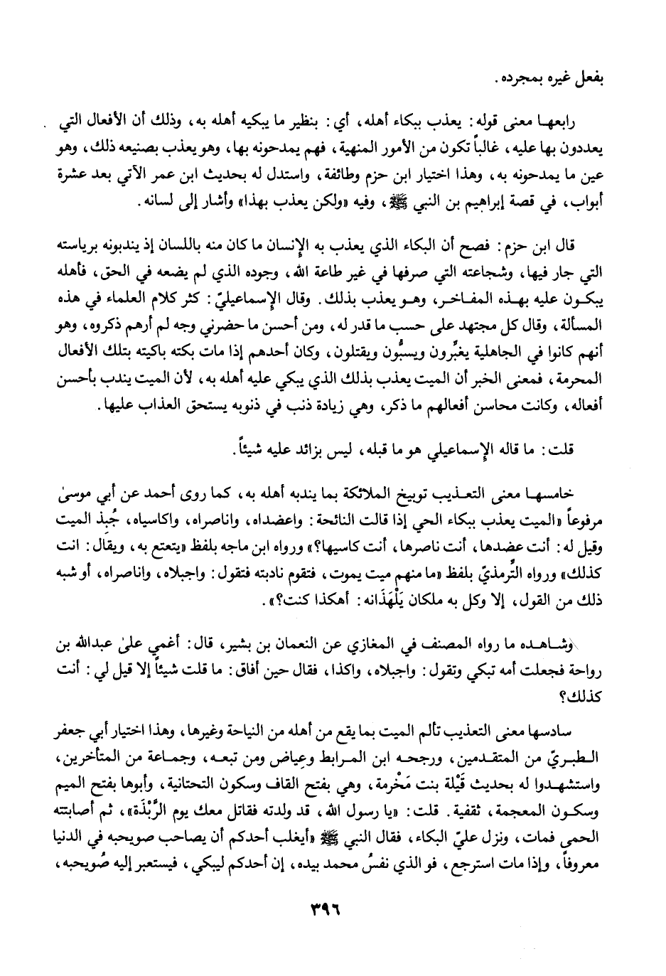 سادسها معنى التعذيب تألم الميت بما يقع من أهله من النياحة وغيرها، وهذا اختيار أبي جعفر الطبريّ من المتقدمين، ورجحه ابن المرابط وعِياض ومن تبعه، وجماعة من المتأخرين، واستشهدوا له بحديث قَيْلة بنت مَخْرمة، وهي بفتح القاف وسكون التحتانية، وأبوها بفتح الميم وسكون المعجمة، ثقفية. قلت: "يا رسول الله، قد ولدته فقاتل معك يوم الرَّبْذَة"، ثم أصابته الحمى فمات، ونزل عليّ البكاء، فقال النبي -صلى الله عليه وسلم- "أيغلب أحدكم أن يصاحب صويحبه في الدنيا معروفًا، وإذا مات استرجع، فوالذي نفسُ محمد بيده، إن أحدكم ليبكي، فيستعبر إليه صُويحبه،