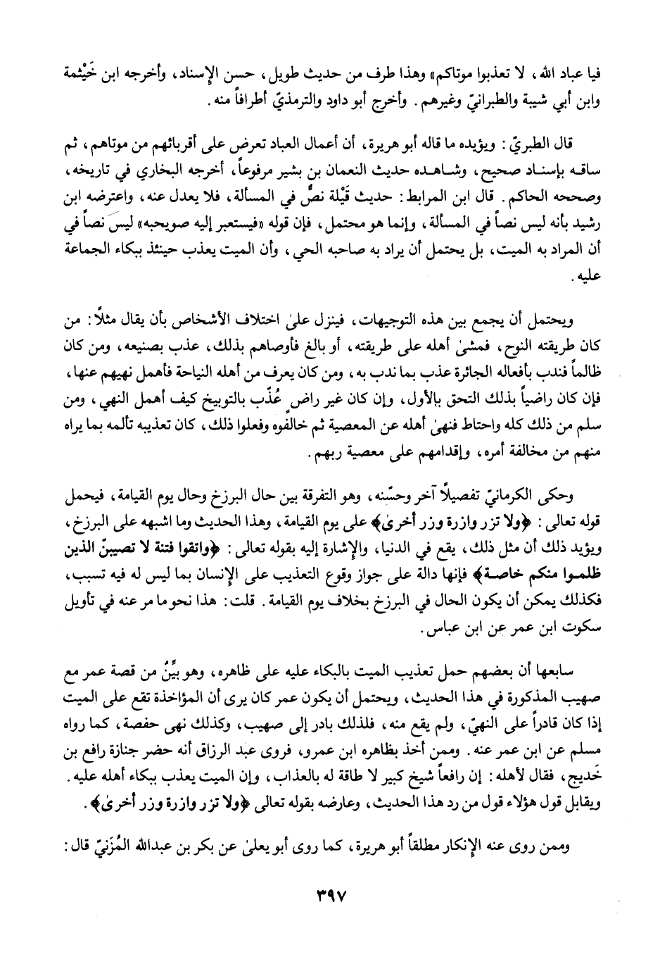 وحكى الكرمانيّ تفصيلًا آخر وحسّنه، وهو التفرقة بين حال البرزخ وحال يوم القيامة، فيحمل قوله تعالى: {وَلَا تَزِرُ وَازِرَةٌ وِزْرَ أُخْرَى} على يوم القيامة، وهذا الحديث وما اشبهه على البرزخ، ويؤيد ذلك أن مثل ذلك، يقع في الدنيا، والإِشارة إليه بقوله تعالى: {وَاتَّقُوا فِتْنَةً لَا تُصِيبَنَّ الَّذِينَ ظَلَمُوا مِنْكُمْ خَاصَّةً} فإنها دالة على جواز وقوع التعذيب على الإنسان بما ليس له فيه تسبب، فكذلك يمكن أن يكون الحال في البرزخ بخلاف يوم القيامة. قلت: هذا نحو ما مرَّ عنه في تأويل سكوت ابن عمر عن ابن عباس.
