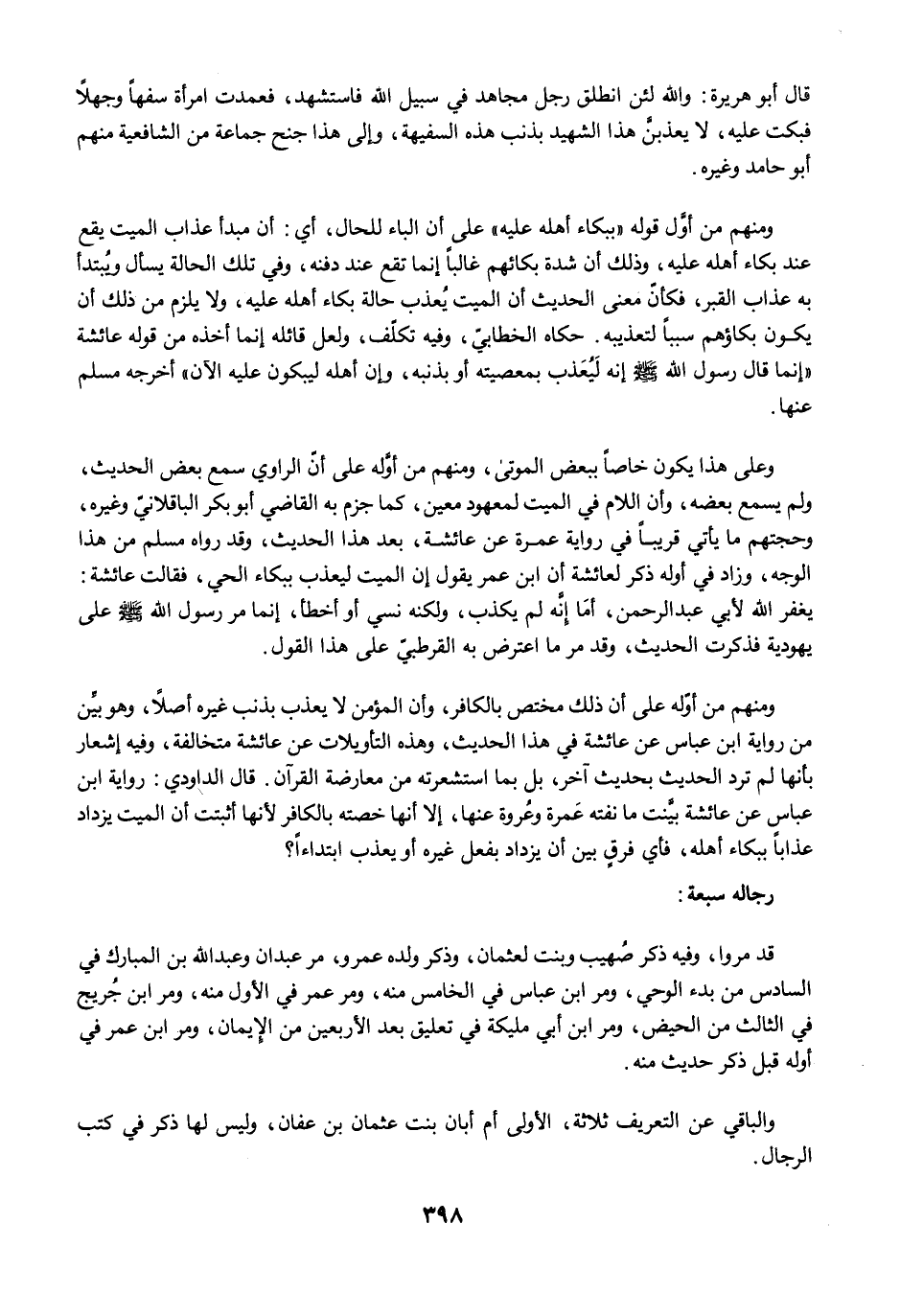 قال أبو هريرة: والله لئن انطلق رجل مجاهد في سبيل الله فاستشهد، فعمدت امرأة سفهًا وجهلًا فبكت عليه، لا يعذبنَّ هذا الشهيد بذنب هذه السفيهة، وإلى هذا جنح جماعة من الشافعية منهم أبو حامد وغيره.