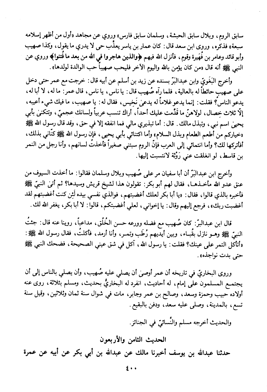 وأخرج البَغَويّ وابن عبد البَرّ بسنده عن زيد بن أسلم عن أبيه قال: خرجت مع عمر حتى دخل على صهيبٍ حائطًا له بالعالية، فلما رآه صُهيب قال: يا ناس، يا ناس، قال عمر: ما له، لا أبا له، يدعو الناس؟ فقلت: إنما يدعو غلامًا له يدعى نَخِيس، فقال له: يا صهيب، ما فيك شيء أعيبه، إلاَّ ثلاث خِصال، لولاهنّ ما قَدَّمت عليك أحدًا، أراك تنسب عربيًا ولسانك عجميّ، وتتكنى بأبي يحيى اسم نبي، وتبذل مالك. قال: أما تبذيري مالي فما انفقه إلا في حق، وقد قال رسول الله -صلى الله عليه وسلم- "خياركم من أطعم الطعام وبذل السلام" وأما اكتنائي بأبي يحيى، فإن رسول الله -صلى الله عليه وسلم- كنّاني بذلك، أفأتركها لك؟ وأما انتمائي إلى العرب فإنّ الروم سبتني صغيرًا فأخذتُ لسانهم، وأنا رجل من النمر بن قاسط، لو انغلقت عني رَوْثة لانتسبت إليها.