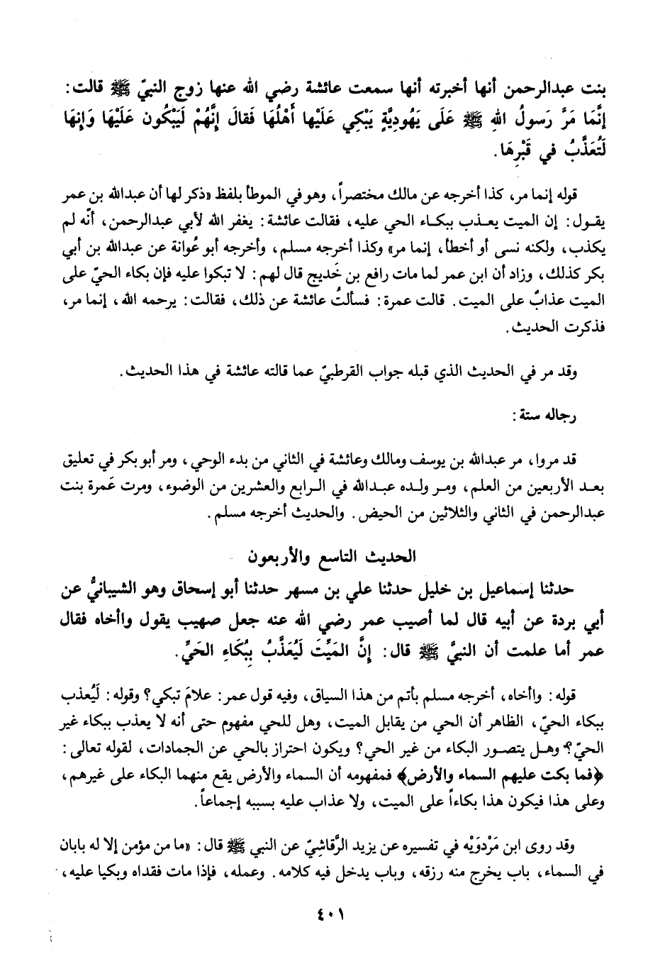 بِنْتِ عَبْدِ الرَّحْمَنِ أَنَّهَا أَخْبَرَتْهُ أَنَّهَا سَمِعَتْ عَائِشَةَ رضي الله عنها زَوْجَ النَّبِيِّ -صلى الله عليه وسلم- قَالَتْ: إِنَّمَا مَرَّ رَسُولُ اللَّهِ -صلى الله عليه وسلم- عَلَى يَهُودِيَّةٍ يَبْكِي عَلَيْهَا أَهْلُهَا فَقَالَ نَّهُمْ لَيَبْكُونَ عَلَيْهَا، وَإِنَّهَا لَتُعَذَّبُ فِي قَبْرِهَا.