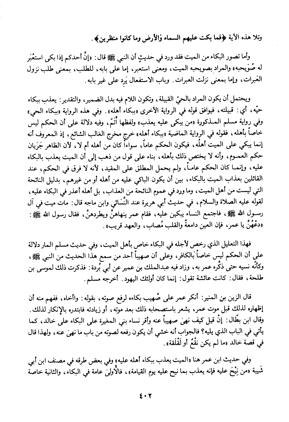 فهذا التعليل الذي رخص لأجله في البكاء خاص بأهل الميت، وفي حديث مسلم المار دلالة علي أن الحكم ليس خاصًا بالكافر، وعلى أن صهيبًا أحد من سمع هذا الحديث من النبي -صلى الله عليه وسلم-، وكأنّه نسيه حتى ذكَّره عمر به، وزاد فيه عبد الملك بن عمير عن أبي بُردة: فذكرت ذلك لموسى بن طلحة، فقال: كانت عائشة تقول: إنما كان أولئك اليهود. أخرجه مسلم.