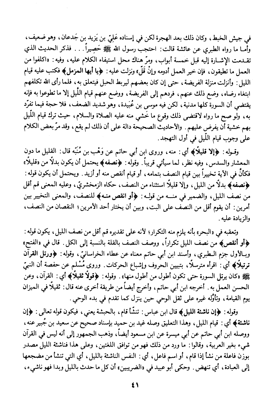 وتعقبه في "البحر" بأنه يلزم منه التكرار؛ لأنه على تقديره قم أقل من نصف الليل، يكون قوله: {أَوِ انْقُصْ} من نصف الليل تكرارًا، ووصف النصف بالقلة بالنسبة إلى الكل. قال في "الفتح" وبالأول جزم الطبري، وأسند ابن أبي حاتم معناه عن عطاء الخراسانى، وقوله: {وَرَتِّلِ الْقُرْآنَ تَرْتِيلًا} أي: اقرأه مترسلاً، بتبيين الحروف وإشباع الحركات. وروى مُسْلم عن حفصة أن النبيّ -صلى الله عليه وسلم- "كان يرتل السورة حتى تكون أطول من أطول منها". وقوله: {قَوْلًا ثَقِيلًا} أي: القرآن، وعن الحسن العمل به. أخرجه ابن أبي حاتم، وأخرج أيضًا من طريقة أخرى عنه قال: ثقيلًا في الميزان يوم القيامة، وتأوَّله غيره على ثقل الوحي حين ينزل كما تقدم في بدء الوحي.