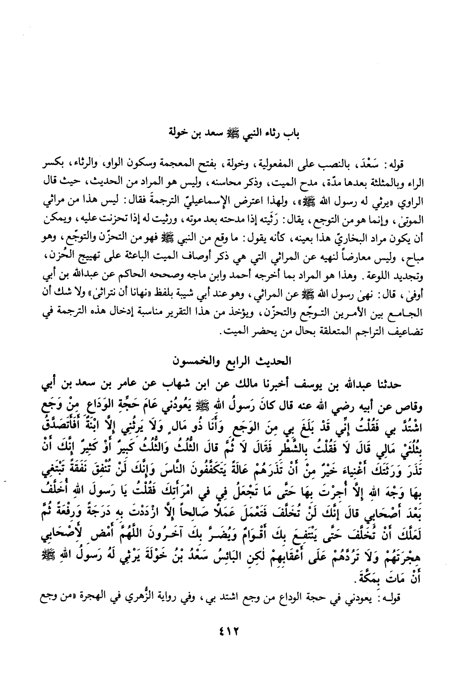 قوله: سَعْدَ، بالنصب على المفعولية، وخولة، بفتح المعجمة وسكون الواو، والرثاء، بكسر الراء وبالمثلثة بعدها مدّة، مدح الميت، وذكر محاسنه، وليس هو المراد من الحديث، حيث قال الراوي "يرثي له رسول الله -صلى الله عليه وسلم-"، ولهذا اعترض الإِسماعيليّ الترجمةَ فقال: ليس هذا من مراثي الموتى، وإنما هو من التوجع، يقال: رَثَيته إذا مدحته بعد موته، ورثيت له إذا تحزنت عليه، ويمكن أن يكون مراد البخاريّ هذا بعينه، كأنه يقول: ما وقع من النبي -صلى الله عليه وسلم- فهو من التحزّن والتوجّع، وهو مباح، وليس معارضًا لنهيه عن المراثي التي هي ذكر أوصاف الميت الباعثة على تهييج الحُزن، وتجديد اللوعة. وهذا هو المراد بما أخرجه أحمد وابن ماجه وصححه الحاكم عن عبد الله بن أبي أوفى، قال: نهى رسول الله -صلى الله عليه وسلم- عن المراثي، وهو عند أبي شيبة بلفظ "نهانا أن نتراثى" ولا شك أن الجامع بين الأمرين التوجّع والتحزّن، ويؤخذ من هذا التقرير مناسبة إدخال هذه الترجمة في تضاعيف التراجم المتعلقة بحال من يحضر الميت.