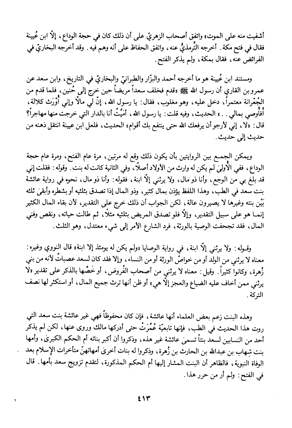 وقوله: ولا يرثني إلاَّ ابنة، في رواية الوصايا "ولم يكن له يومئذ إلا ابنة" قال النووي وغيره: معناه لا يرثني من الولد أو من خواصّ الورثة أو من النساء، وإلا فقد كان لسعد عصباتٌ لأنه من بني زُهرة، وكانوا كثيرًا. وقيل: معناه لا يرثني من أصحاب الفُروض، أو خَصَّها بالذكر على تقدير "لا يرثني ممن أخاف عليه الضياع والعجز إلاّ هي" أو ظن أنها ترث جميع المال، أو استكثر لها نصف التركة.