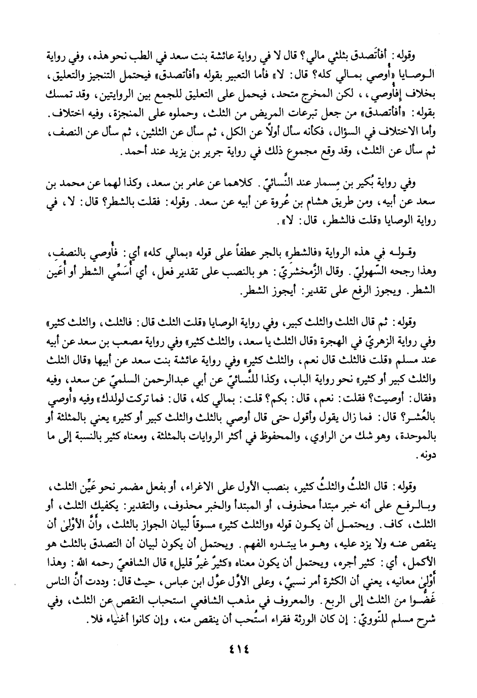 وقوله: قال الثلثُ والثلثُ كثير، بنصب الأول على الاغراء، أو بفعل مضمر نحو عَيِّن الثلث، وبالرفع على أنه خبر مبتدأ محذوف، أو المبتدأ والخبر محذوف، والتقدير: يكفيك الثلث، أو الثلث، كاف. ويحتمل أن يكون قوله "والثلث كثير" مسوقًا لبيان الجواز بالثلث، وأَنَّ الأوْلى أن ينقص عنه ولا يزد عليه، وهو ما يبتدره الفهم. ويحتمل أن يكون لبيان أن التصدق بالثلث هو الأكمل، أي: كثير أجره، ويحتمل أن يكون معناه "كثيرٌ غيرُ قليل" قال الشافعيّ رحمه الله: وهذا أَوْلي معانيه، يعني أن الكثرة أمر نسبيٌ، وعلى الأوَّل عوَّل ابن عباس، حيث قال: وددت أنَّ الناس غَضُّوا من الثلث إلى الربع. والمعروف في مذهب الشافعي استحباب النقص عن الثلث، وفي شرح مسلم للنّوويّ: إن كان الورثة فقراء استُحب أن ينقص منه، وإن كانوا أغنياء فلا.