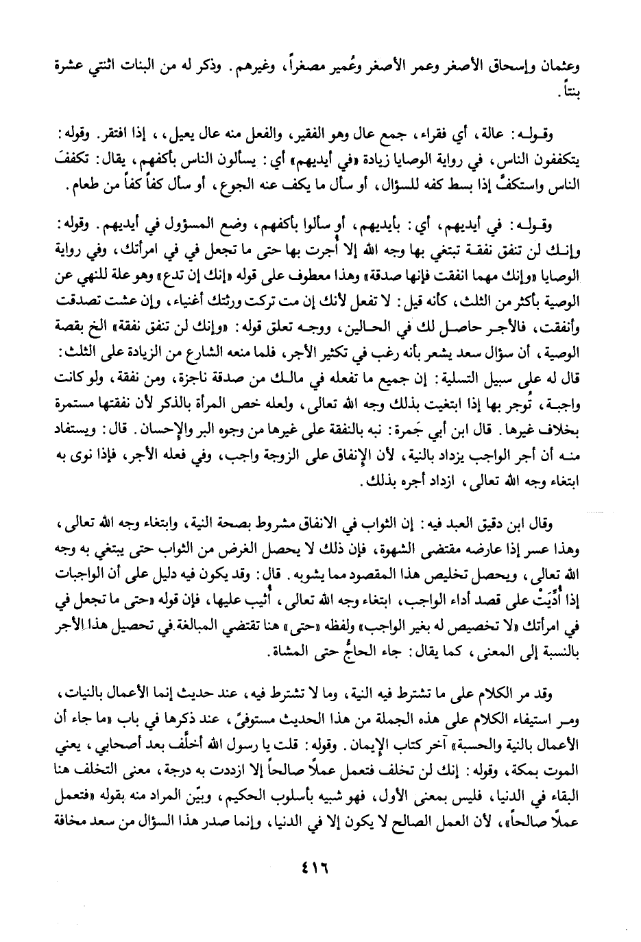 وقوله: عالة، أي فقراء، جمع عال وهو الفقير، والفعل منه عال يعيل،، إذا افتقر. وقوله: يتكففون الناس، في رواية الوصايا زيادة "في أيديهم" أي: يسألون الناس بأكفهم، يقال: تكففَ الناس واستكفَّ إذا بسط كفه للسؤال، أو سأل ما يكف عنه الجوع، أو سأل كفًا كفًا من طعام.