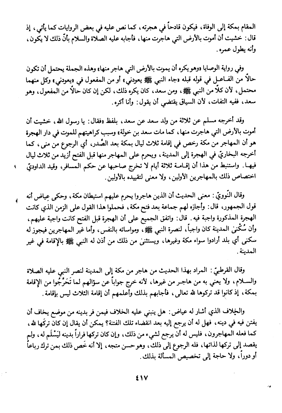 وقال القرطبيّ: المراد بهذا الحديث من هاجر من مكة إلى المدينة لنصر النبي عليه الصلاة والسلام، ولا يعني به من هاجر من غيرها, لأنه خرج جوابًا عن سؤالهم لما تَحَرَّجُوا من الإقامة بمكة، إذ كانوا قد تركوها لله تعالى، فأجابهم بذلك وأعلمهم أن إقامة الثلاث ليس بإقامة.