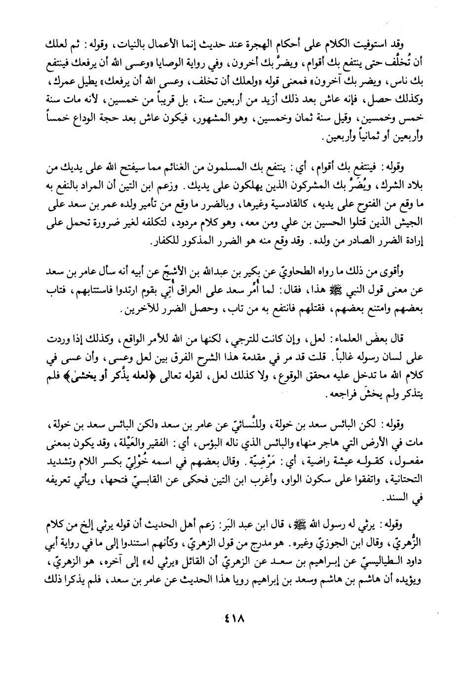 وقد استوفيت الكلام على أحكام الهجرة عند حديث إنما الأعمال بالنيات، وقوله: ثم لعلك أن تُخلَّف حتى ينتفع بك أقوام، ويضرَّ بك أخرون، وفي رواية الوصايا "وعسى الله أن يرفعك فينتفع بك ناس، ويضر بك آخرون" فمعنى قوله "ولعلك أن تخلف، وعسى الله أن يرفعك" يطيل عمرك، وكذلك حصل، فإنه عاش بعد ذلك أزيد من أربعين سنة، بل قريبًا من خمسين, لأنه مات سنة خمس وخمسين، وقيل سنة ثمان وخمسين، وهو المشهور، فيكون عاش بعد حجة الوداع خمسًا وأربعين أو ثمانيًا وأربعين.