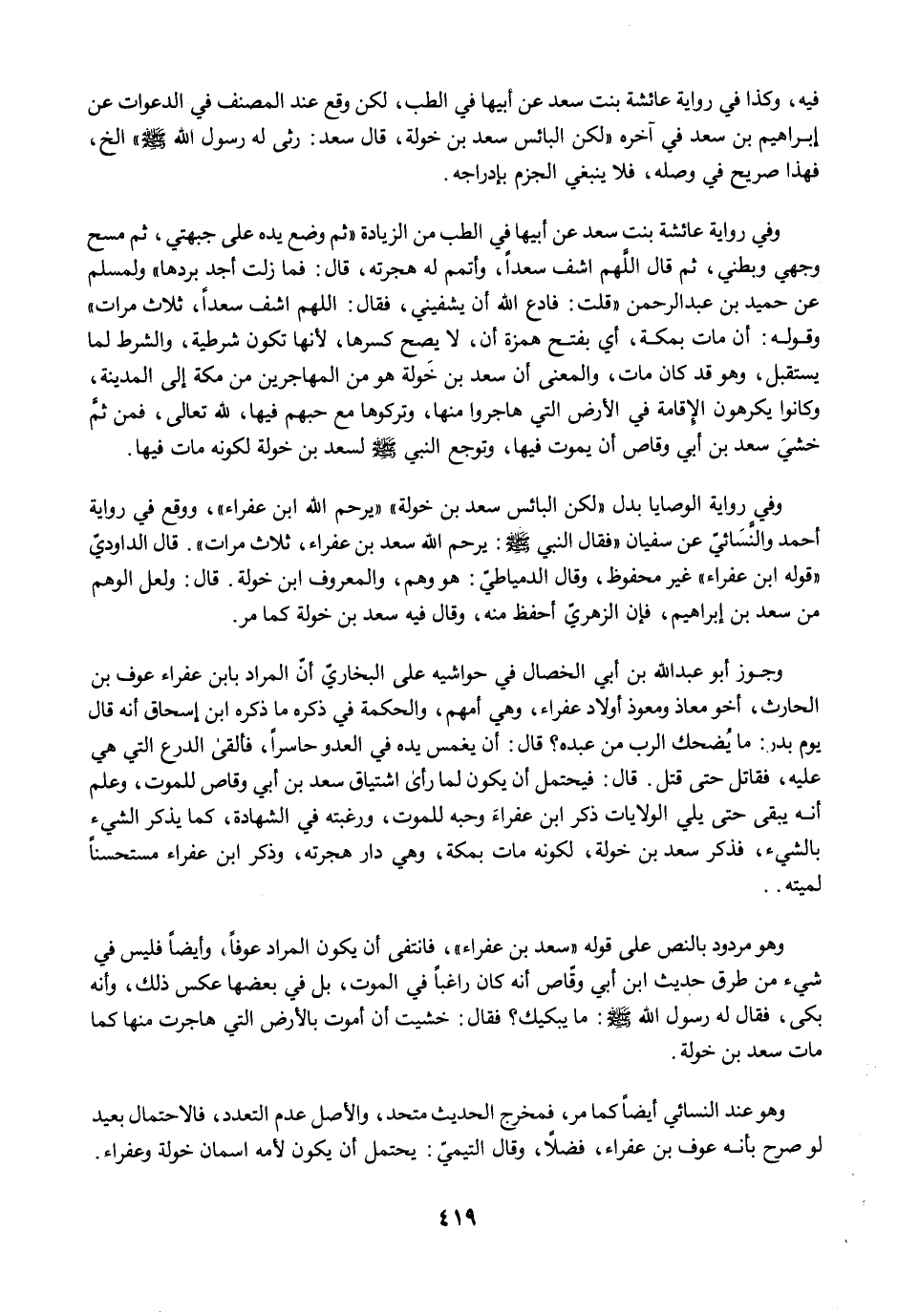 وهو مردود بالنص على قوله "سعد بن عفراء"، فانتفى أن يكون المراد عوفًا, وأيضًا فليس في شيء من طرق حديث ابن أبي وقّاص أنه كان راغبًا في الموت، بل في بعضها عكس ذلك، وأنه بكى، فقال له رسول الله -صلى الله عليه وسلم-: ما يبكيك؟ فقال: خشيت أن أموت بالأرض التي هاجرت منها كما مات سعد بن خولة.