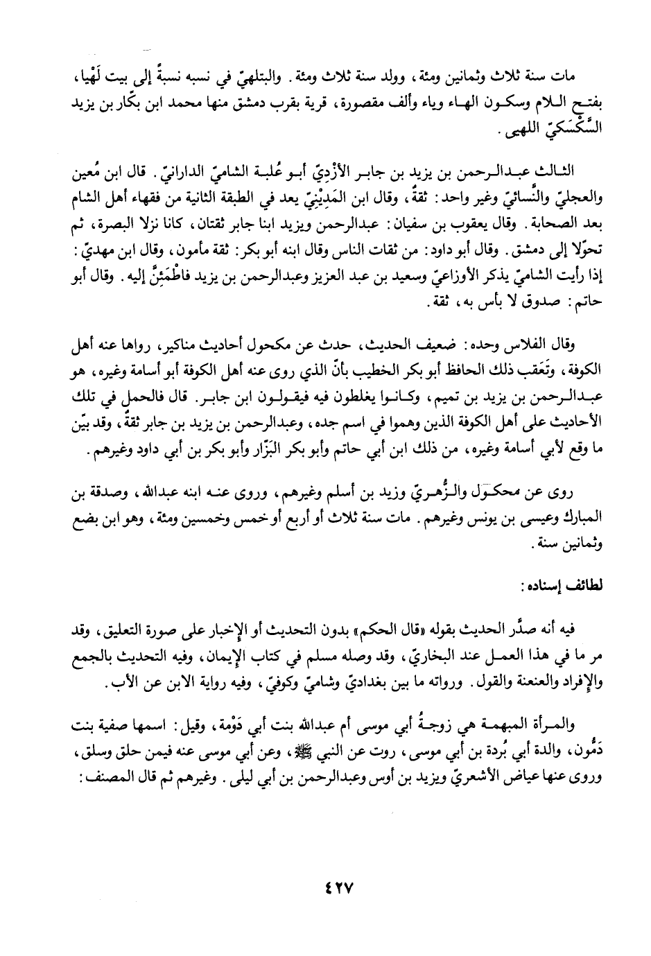الثالث عبد الرحمن بن يزيد بن جابر الأزْدِيّ أبو عُلبة الشاميّ الدارانيّ. قال ابن مُعين والعجليّ والنَّسائيّ وغير واحد: ثقةٌ، وقال ابن المَدِيْنِيّ يعد في الطبقة الثانية من فقهاء أهل الشام بعد الصحابة. وقال يعقوب بن سفيان: عبد الرحمن ويزيد ابنا جابر ثقتان، كانا نزلا البصرة، ثم تحوّلا إلى دمشق. وقال أبو داود: من ثقات الناس وقال ابنه أبو بكر: ثقة مأمون، وقال ابن مهديّ: إذا رأيت الشاميّ يذكر الأوزاعيّ وسعيد بن عبد العزيز وعبد الرحمن بن يزيد فاطْمَئِنَّ إليه. وقال أبو حاتم: صدوق لا بأس به، ثقة.