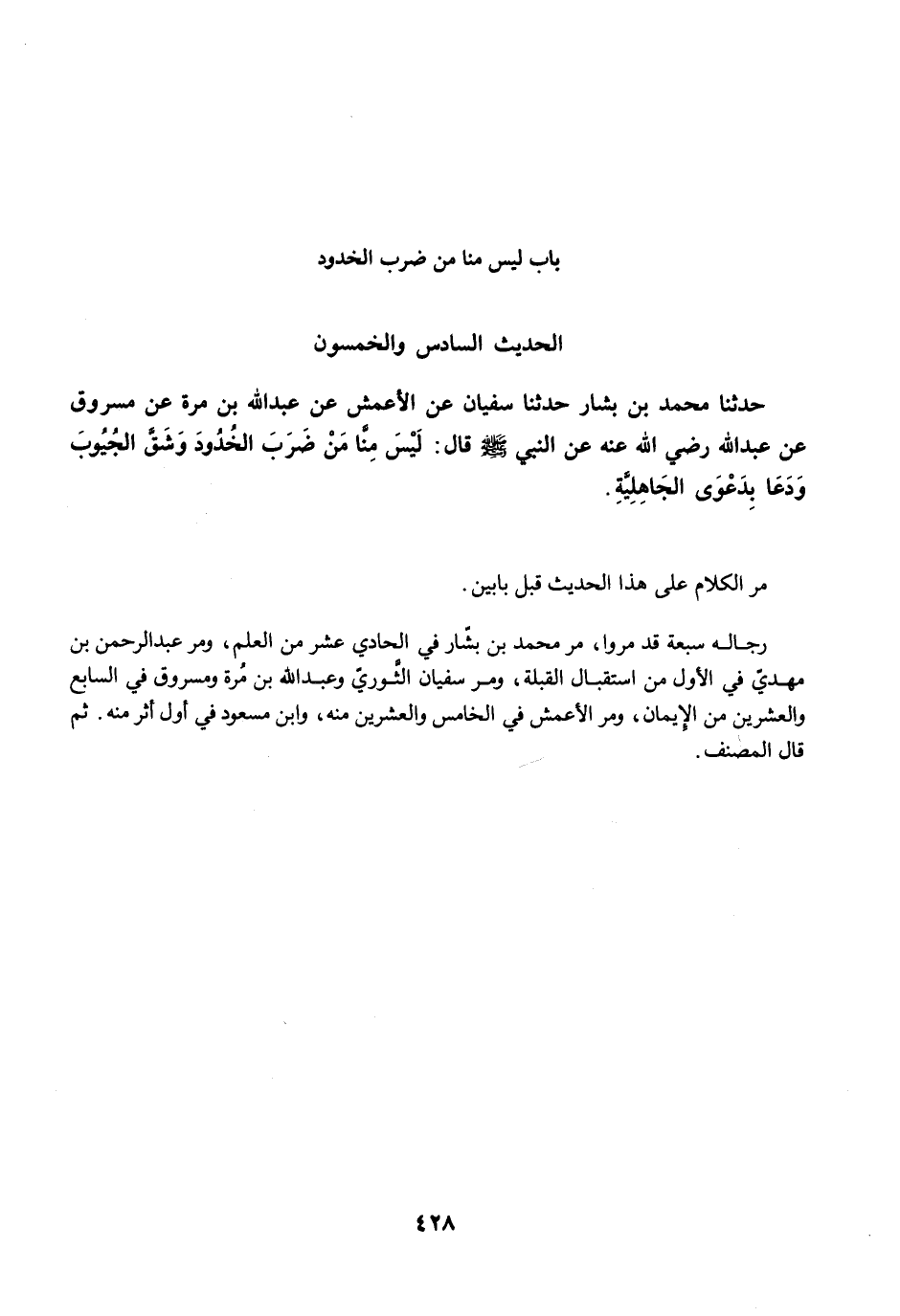حَدَّثَنَا مُحَمَّدُ بْنُ بَشَّارٍ حَدَّثَنَا سُفْيَانُ عَنِ الأَعْمَشِ عَنْ عَبْدِ اللَّهِ بْنِ مُرَّةَ عَنْ مَسْرُوقٍ عَنْ عَبْدِ اللَّهِ رضي الله عنه عَنِ النَّبِيِّ -صلى الله عليه وسلم- قَالَ: لَيْسَ مِنَّا مَنْ ضَرَبَ الْخُدُودَ، وَشَقَّ الْجُيُوبَ، وَدَعَا بِدَعْوَى الْجَاهِلِيَّةِ.