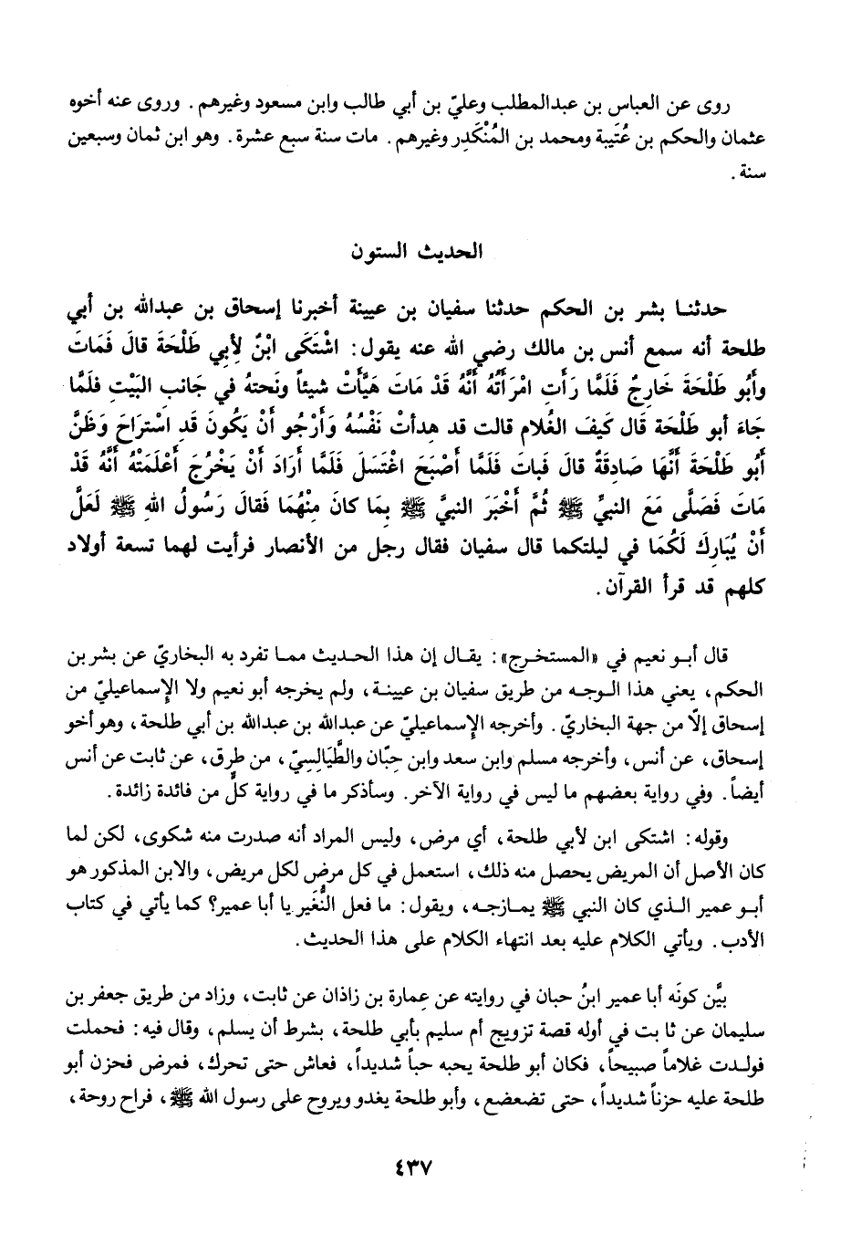 حَدَّثَنَا بِشْرُ بْنُ الْحَكَمِ حَدَّثَنَا سُفْيَانُ بْنُ عُيَيْنَةَ أَخْبَرَنَا إِسْحَاقُ بْنُ عَبْدِ اللَّهِ بْنِ أَبِي طَلْحَةَ أَنَّهُ سَمِعَ أَنَسَ بْنَ مَالِكٍ رضي الله عنه يَقُولُ: اشْتَكَى ابْنٌ لأَبِي طَلْحَةَ قَالَ فَمَاتَ وَأَبُو طَلْحَةَ خَارِجٌ، فَلَمَّا رَأَتِ امْرَأَتُهُ أَنَّهُ قَدْ مَاتَ هَيَّأَتْ شَيْئًا وَنَحَّتْهُ فِي جَانِبِ الْبَيْتِ، فَلَمَّا جَاءَ أَبُو طَلْحَةَ قَالَ كَيْفَ الْغُلاَمُ قَالَتْ قَدْ هَدَأَتْ نَفْسُهُ، وَأَرْجُو أَنْ يَكُونَ قَدِ اسْتَرَاحَ. وَظَنَّ أَبُو طَلْحَةَ أَنَّهَا صَادِقَةٌ، قَالَ فَبَاتَ، فَلَمَّا أَصْبَحَ اغْتَسَلَ، فَلَمَّا أَرَادَ أَنْ يَخْرُجَ، أَعْلَمَتْهُ أَنَّهُ قَدْ مَاتَ، فَصَلَّى مَعَ النَّبِيِّ -صلى الله عليه وسلم- ثُمَّ أَخْبَرَ النَّبِيَّ -صلى الله عليه وسلم- بِمَا كَانَ مِنْهُمَا، فَقَالَ رَسُولُ اللَّهِ -صلى الله عليه وسلم- لَعَلَّ اللَّهَ أَنْ يُبَارِكَ لَكُمَا فِي لَيْلَتِكُمَا. قَالَ سُفْيَانُ فَقَالَ رَجُلٌ مِنَ الأَنْصَارِ فَرَأَيْتُ لَهُمَا تِسْعَةَ أَوْلاَدٍ كُلُّهُمْ قَدْ قَرَأَ الْقُرْآنَ.