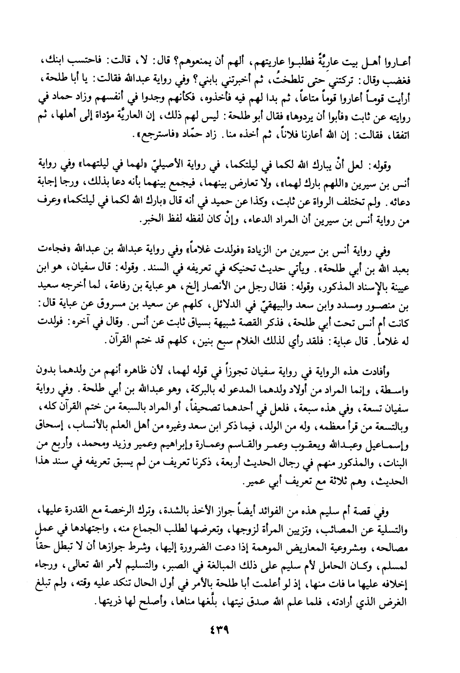 أعاروا أهل بيت عارِيَّةً فطلبوا عاريتهم، ألهم أن يمنعوهم؟ قال: لا، قالت: فاحتسب ابنك، فغضب وقال: تركتني حتى تلطختُ، ثم أخبرتني بابني؟ وفي رواية عبد الله فقالت: يا أبا طلحة، أرأيت قومًا أعاروا قومًا متاعًا، ثم بدا لهم فيه فأخذوه، فكأنهم وجدوا في أنفسهم وزاد حماد في روايته عن ثابت "فأبوا أن يردوها" فقال أبو طلحة: ليس لهم ذلك، إن العاريَّة مؤداة إلى أهلها، ثم اتفقا، فقالت: إن الله أعارنا فلانًا، ثم أخذه منا. زاد حمّاد "فاسترجع".