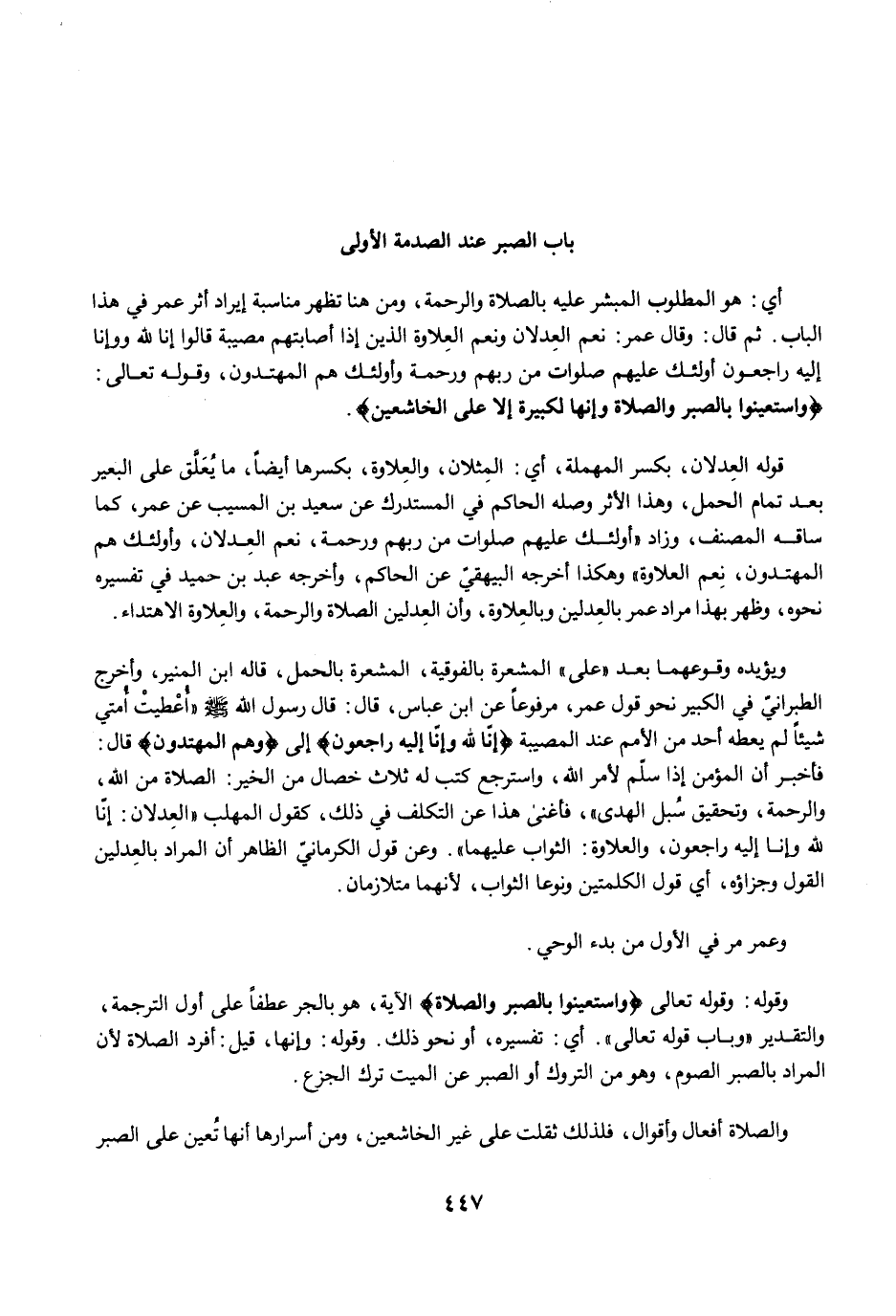أي: هو المطلوب المبشر عليه بالصلاة والرحمة، ومن هنا تظهر مناسبة إيراد أثر عمر في هذا الباب. ثم قال: وقال عمر: نعم العِدلان ونعم العِلاوة الذين إذا أصابتهم مصيبة قالوا إنا لله وإنا إليه راجعون أولئك عليهم صلوات من ربهم ورحمة وأولئك هم المهتدون، وقوله تعالى: {وَاسْتَعِينُوا بِالصَّبْرِ وَالصَّلَاةِ وَإِنَّهَا لَكَبِيرَةٌ إِلَّا عَلَى الْخَاشِعِينَ}.