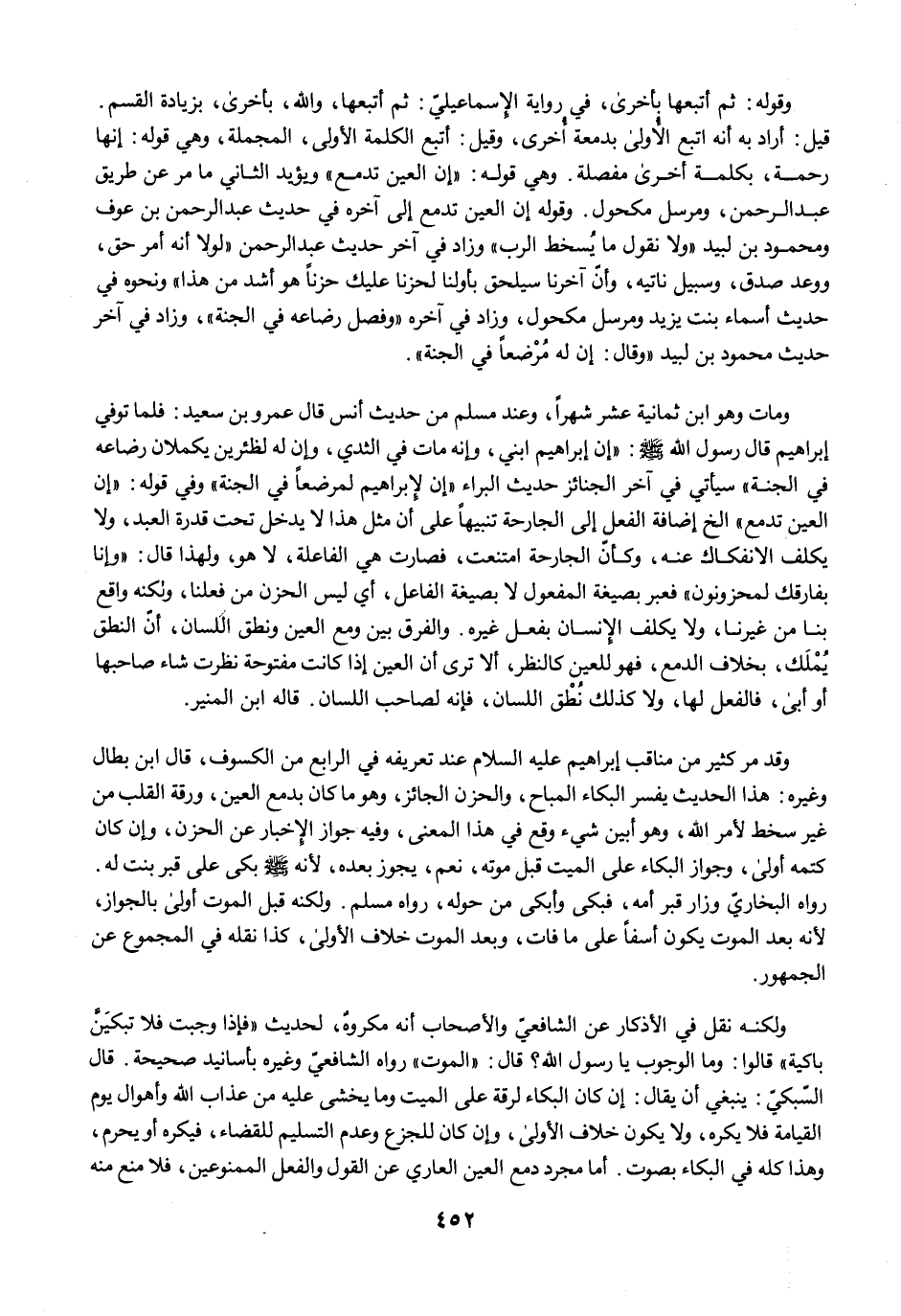 وقد مرَّ كثير من مناقب إبراهيم عليه السلام عند تعريفه في الرابع من الكسوف، قال ابن بطال وغيره: هذا الحديث يفسر البكاء المباح، والحزن الجائز، وهو ما كان بدمع العين، ورقة القلب من غير سخط لأمر الله، وهو أبين شيء وقع في هذا المعنى، وفيه جواز الإخبار عن الحزن، وإن كان كتمه أولى، وجواز البكاء على الميت قبل موته، نعم، يجوز بعده, لأنه -صلى الله عليه وسلم- بكى على قبر بنت له. رواه البخاريّ وزار قبر أمه، فبكى وأبكى من حوله، رواه مسلم. ولكنه قبل الموت أولى بالجواز، لأنه بعد الموت يكون أسفًا على ما فات، وبعد الموت خلاف الأولى، كذا نقله في المجموع عن الجمهور.