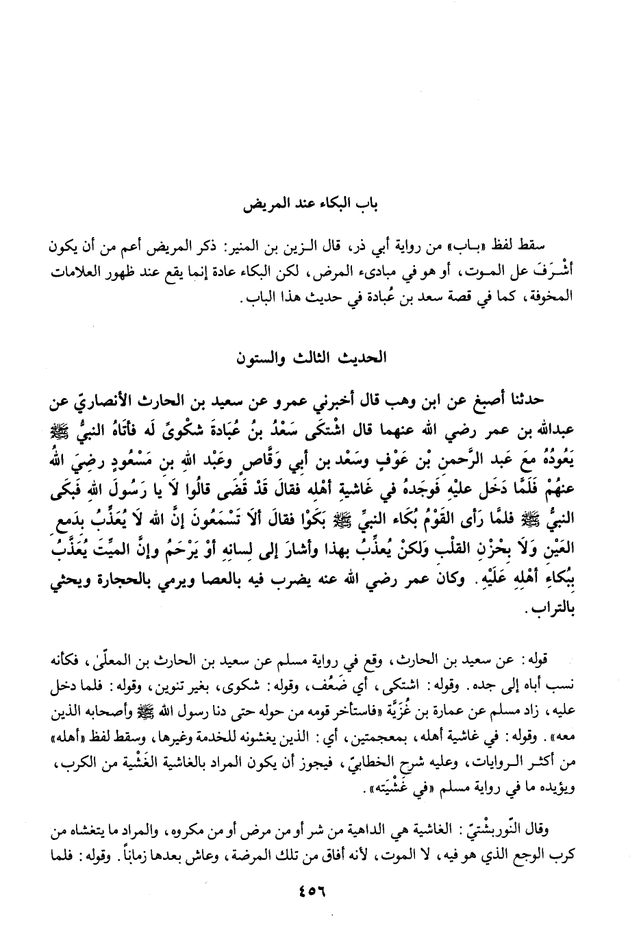 سقط لفظ "باب" من رواية أبي ذر، قال الزين بن المنير: ذكر المريض أعم من أن يكون أشْرَفَ على الموت، أو هو في مبادىء المرض، لكن البكاء عادة إنما يقع عند ظهور العلامات المخوفة، كما في قصة سعد بن عُبادة في حديث هذا الباب.