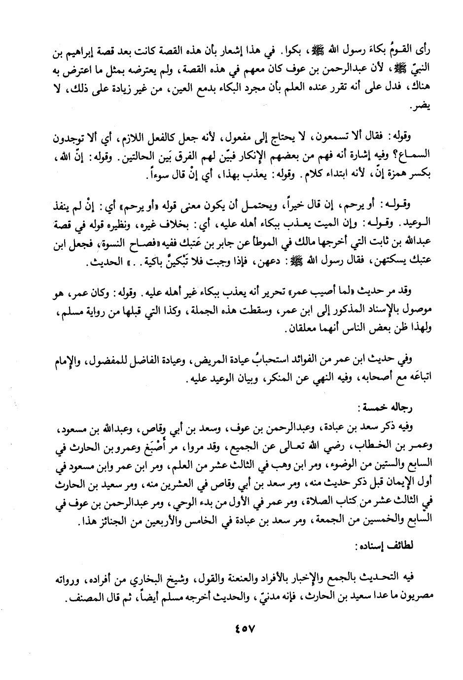 رأى القومُ بكاءَ رسول الله -صلى الله عليه وسلم-، بكوا. في هذا إشعار بأن هذه القصة كانت بعد قصة إبراهيم بن النبيّ -صلى الله عليه وسلم- , لأن عبد الرحمن بن عوف كان معهم في هذه القصة، ولم يعترضه بمثل ما اعترض به هناك، فدل على أنه تقرر عنده العلم بأن مجرد البكاء بدمع العين، من غير زيادة على ذلك، لا يضر.