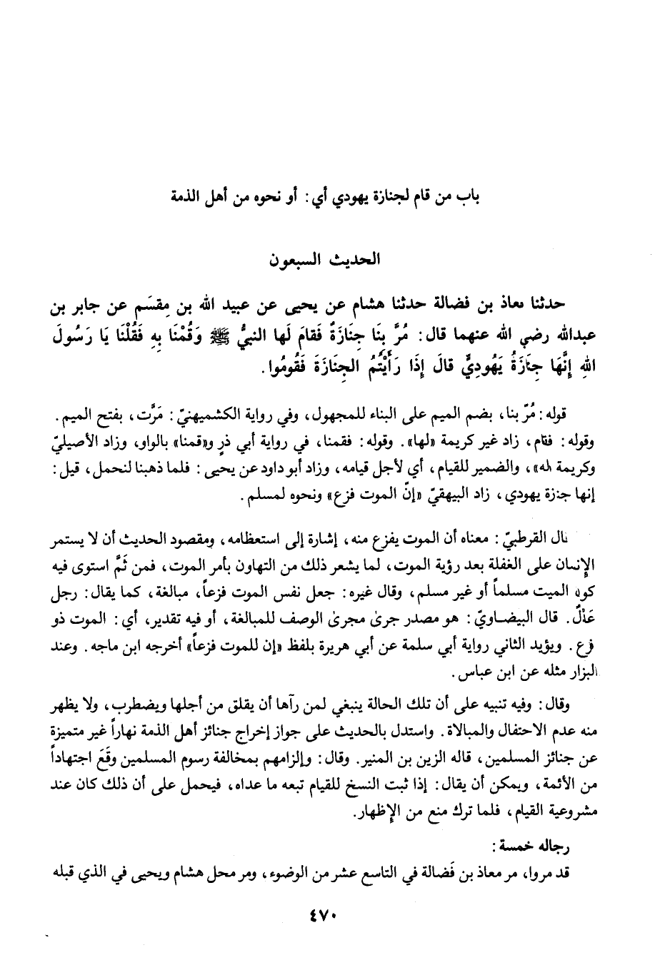 وقال: وفيه تنبيه على أن تلك الحالة ينبغي لمن رآها أن يقلق من أجلها ويضطرب، ولا يظهر منه عدم الاحتفال والمبالاة. واستدل بالحديث على جواز إخراج جنائز أهل الذمة نهارًا غير متميزة عن جنائز المسلمين، قاله الزين بن المنير. وقال: وإلزامهم بمخالفة رسوم المسلمين وقَعَ اجتهادًا من الأئمة، ويمكن أن يقال: إذا ثبت النسخ للقيام تبعه ما عداه، فيحمل على أن ذلك كان عند مشروعية القيام، فلما ترك منع من الإِظهار.