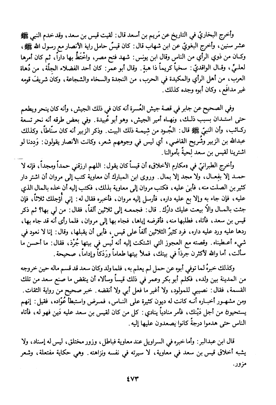 وفي الصحيح عن جابر في قصة جيش العُسرة أنه كان في ذلك الجيش، وأنه كان ينحر ويطعم حتى استدان بسبب ذلك، ونهاه أمير الجيش، وهو أبو عُبيدة. وفي بعض طرقه أنه نحر تسعة ركائب، وأن النبيّ -صلى الله عليه وسلم- قال: الجُود من شِيمة ذلك البيت. وذكر الزبير أنه كان سنّاطًا، وكذلك عبد الله بن الزبير وشُريح القاضي، أي ليس في وجوههم شعر، وكانت الأنصار يقولون: وَدِدنا لو اشترينا لقيس بن سعد لِحيةً بأموالنا.