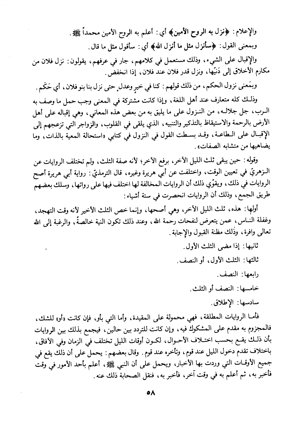 وذلك كله متعارف عند أهل اللغة، وإذا كانت مشتركة في المعنى وجب حمل ما وصف به الرب، جل جلاله، من النزول على ما يليق به من بعض هذه المعاني، وهي إقباله على أهل الأرض بالرحمة والاستيقاظ بالتذكير والتنبيه، الذي يلقى في القلوب، والزواجر التي تزعجهم إلى الإقبال على الطاعة، وقد بسطت القول في النزول في كتابي "استحالة المعية بالذات، وما يضاهيها من متشابه الصفات".