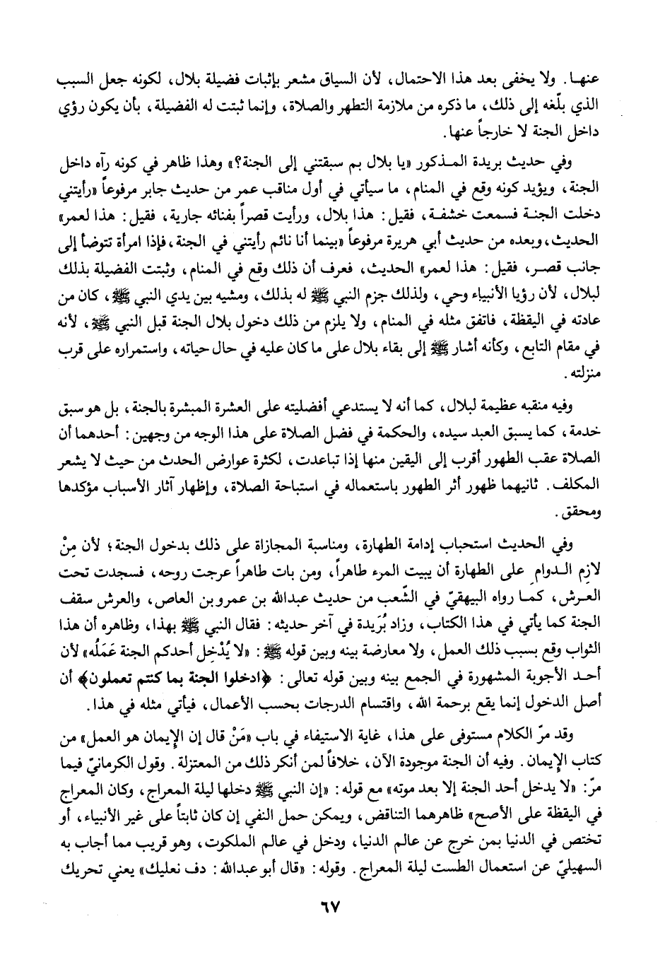 وفي الحديث استحباب إدامة الطهارة، ومناسبة المجازاة على ذلك بدخول الجنة؛ لأن مِنْ لازم الدوام على الطهارة أن يبيت المرء طاهرًا، ومن بات طاهرًا عرجت روحه، فسجدت تحت العرش، كما رواه البيهقي في الشعب من حديث عبد الله بن عمرو بن العاص، والعرش سقف الجنة كما يأتي في هذا الكتاب، وزاد بُرَيدة في آخر حديثه: فقال النبي -صلى الله عليه وسلم- بهذا، وظاهره أن هذا