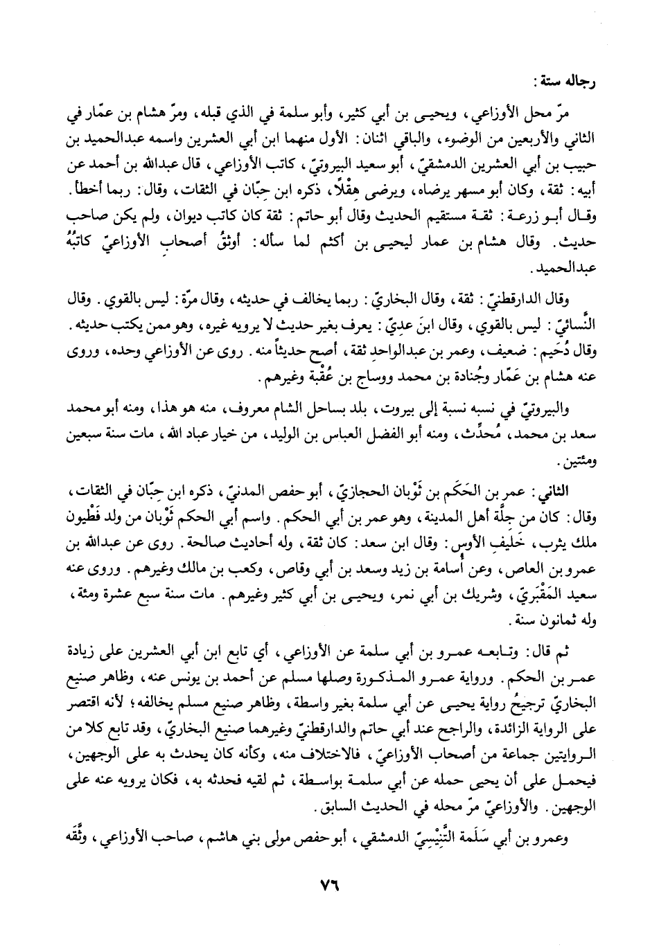 مرّ محل الأوزاعي، ويحيى بن أبي كثير، وأبو سلمة في الذي قبله، ومرّ هشام بن عمّار في الثاني والأربعين من الوضوء، والباقي اثنان: الأول منهما ابن أبي العشرين واسمه عبد الحميد بن حبيب بن أبي العشرين الدمشقيّ، أبو سعيد البيروتيّ، كاتب الأوزاعي، قال عبد الله بن أحمد عن أبيه: ثقة، وكان أبو مسهر يرضاه، ويرضى هِقْلاً، ذكره ابن حِبّان في الثقات، وقال: ربما أخطأ. وقال أبو زرعة: ثقة مستقيم الحديث وقال أبو حاتم: ثقة كان كاتب ديوان، ولم يكن صاحب حديث. وقال هشام بن عمار ليحيى بن أكثم لما سأله: أوثقُ أصحابِ الأوزاعيّ كاتبُهُ عبد الحميد.