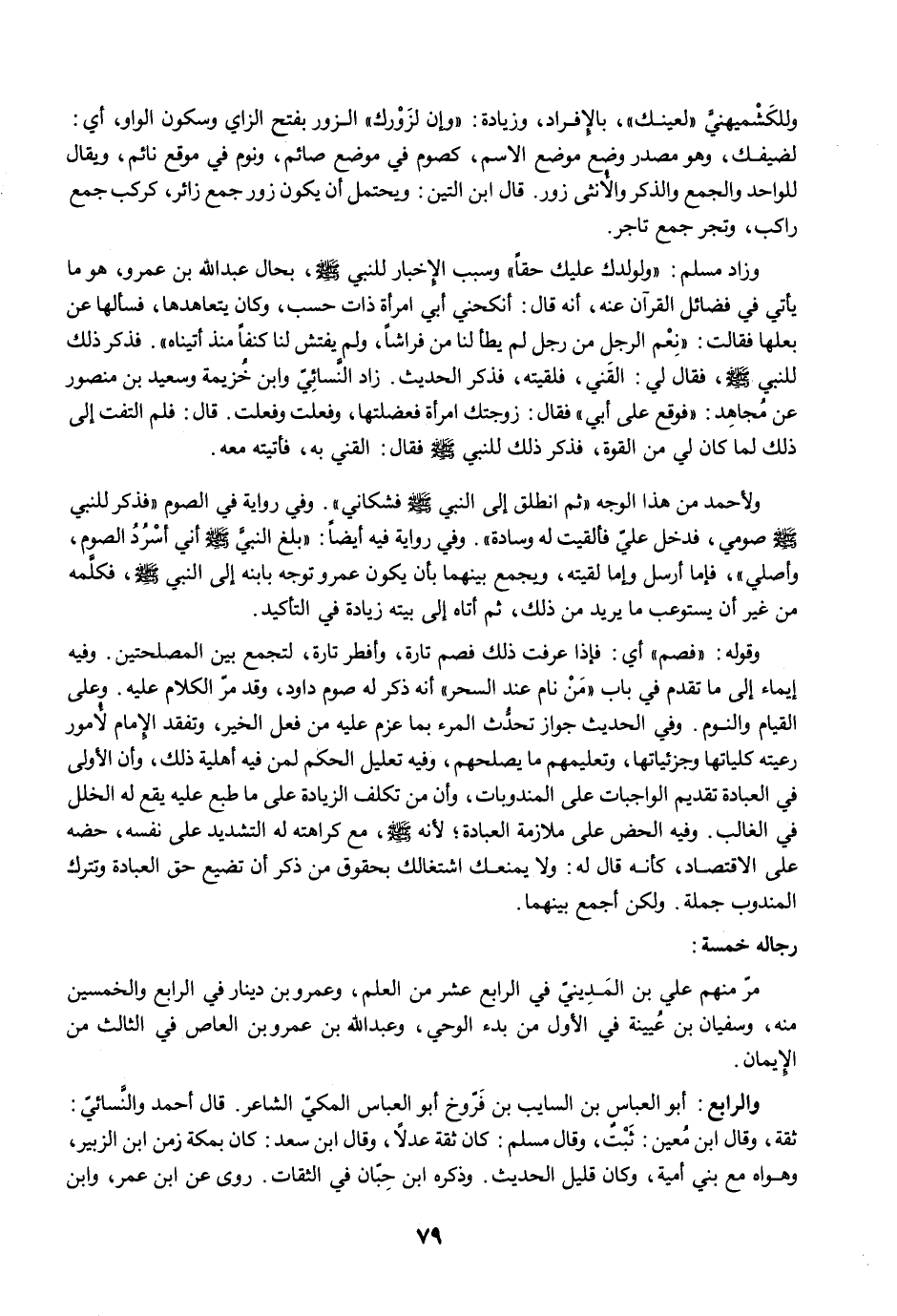 وزاد مسلم: "ولولدك عليك حقًا" وسبب الإخبار للنبي -صلى الله عليه وسلم-، بحال عبد الله بن عمرو، هو ما يأتي في فضائل القرآن عنه، أنه قال: أنكحني أبي امرأة ذات حسب، وكان يتعاهدها، فسألها عن بعلها فقالت: "نِعْم الرجل من رجل لم يطأ لنا من فراشًا، ولم يفتش لنا كنفًا منذ أتيناه". فذكر ذلك للنبي -صلى الله عليه وسلم-، فقال لي: القَني، فلقيته، فذكر الحديث. زاد النَّسائِيّ وابن خُزيمة وسعيد بن منصور عن مجاهِد: "فوقع على أبي" فقال: زوجتك امرأة فعضلتها، وفعلت وفعلت. قال: فلم التفت إلى ذلك لما كان لي من القوة، فذكر ذلك للنبي -صلى الله عليه وسلم- فقال: القني به، فأتيته معه.