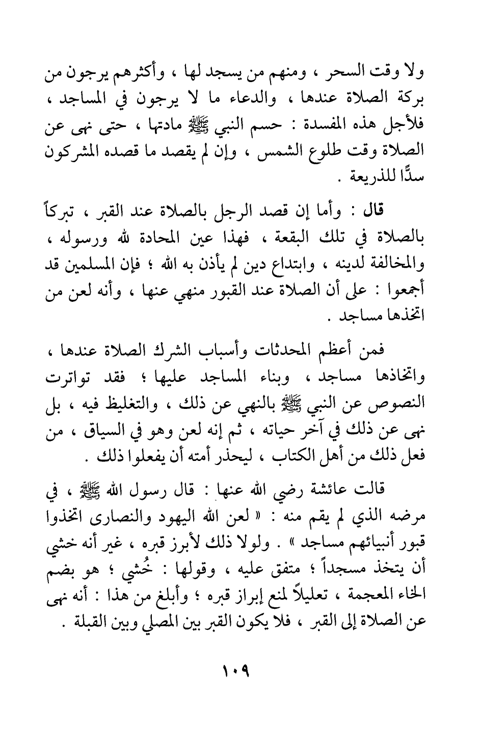 قال: وأما إن قصد الرجل بالصلاة عند القبر تبركا بالصلاة في تلك البقعة، فهذا عين المحادة لله ورسوله، والمخالفة لدينه، وابتداع دين لم يأذن به الله; فإن المسلمين قد أجمعوا على أن الصلاة عند القبور منهي عنها، وأنه لعن من اتخذها مساجد. فمن أعظم المحدثات وأسباب الشرك الصلاة عندها، واتخاذها مساجد، وبناء المساجد عليها; فقد تواترت النصوص عن النبي صلى الله عليه وسلم بالنهي عن ذلك، والتغليظ فيه؛ بل نهى عن ذلك في آخر حياته، ثم إنه لعن وهو في السياق، من فعل ذلك من أهل الكتاب، ليحذر أمته أن يفعلوا ذلك.